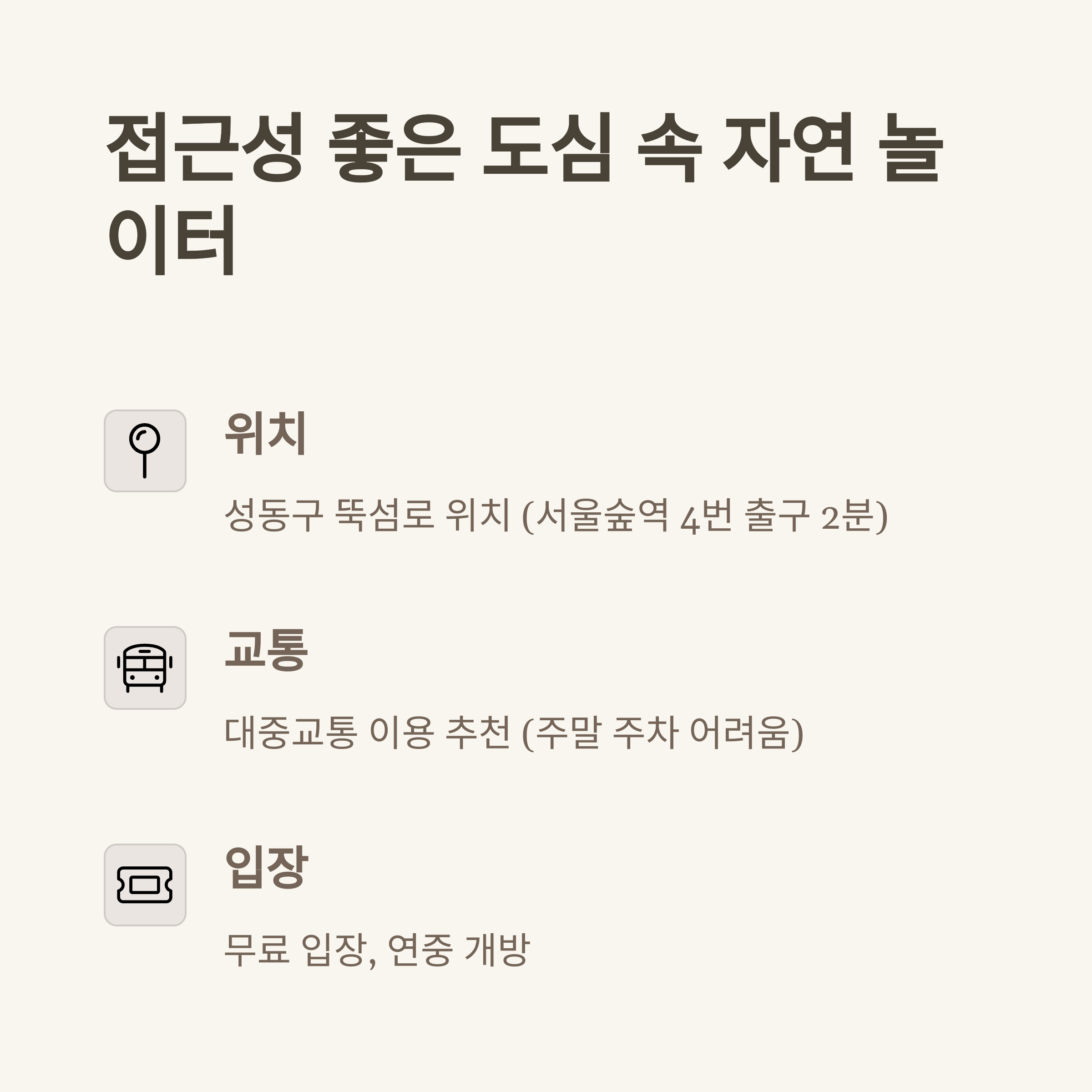 | 위치 | 서울특별시 성동구 서울숲2길 32 (서울숲공원 내) |