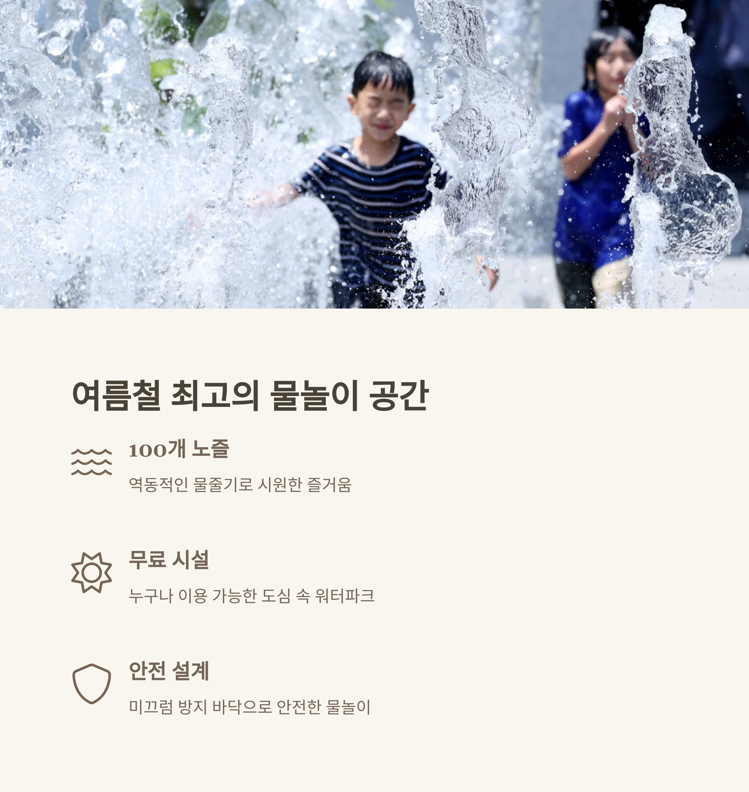 | 모래놀이, 회전놀이기구, 미끄럼틀, 전망대 | 자연 친화적 설계, 쉼터와 벤치, 음수대, 그늘존 | 여름엔 분수, 봄가을엔 피크닉, 겨울엔 산책 |