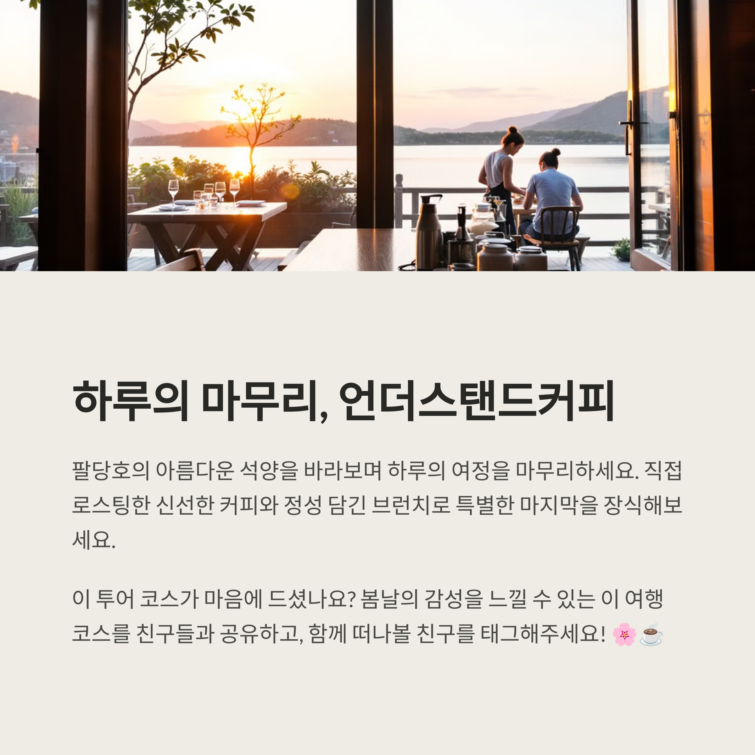 여행의 마무리는 광주 언더스탠드커피에서 즐기는 저녁 브런치입니다. 팔당호의 석양을 바라보며 직접 로스팅한 커피 한 잔과 함께 하루를 정리하는 이 순간은 그 어떤 여행보다 감성적으로 다가옵니다. 자연 속 여유와 감각적인 공간, 그리고 맛있는 음식이 더해진다면 하루가 더욱 아름답게 기억될 것입니다.