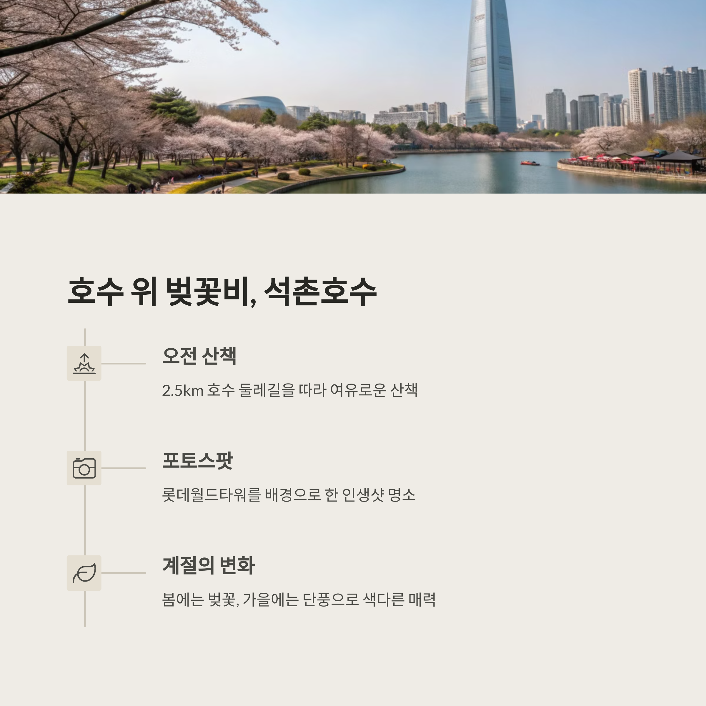 브런치 투어의 묘미는 장소에 따라 다른 감성을 느낄 수 있다는 점입니다. 석촌호수는 고요한 물가와 벚꽃 풍경이 어우러져 감성적인 분위기를 자아냅니다. 산책 후 들른 오린지 카페에서는 향긋한 쑥 갸토와 부드러운 라떼가 여유로운 순간을 만들어줍니다. 이어서 가평 쁘띠프랑스를 둘러본 뒤 자연 속에 자리한 카페 산에서는 고요한 힐링과 함께 여유로운 티타임을 만끽할 수 있어요.