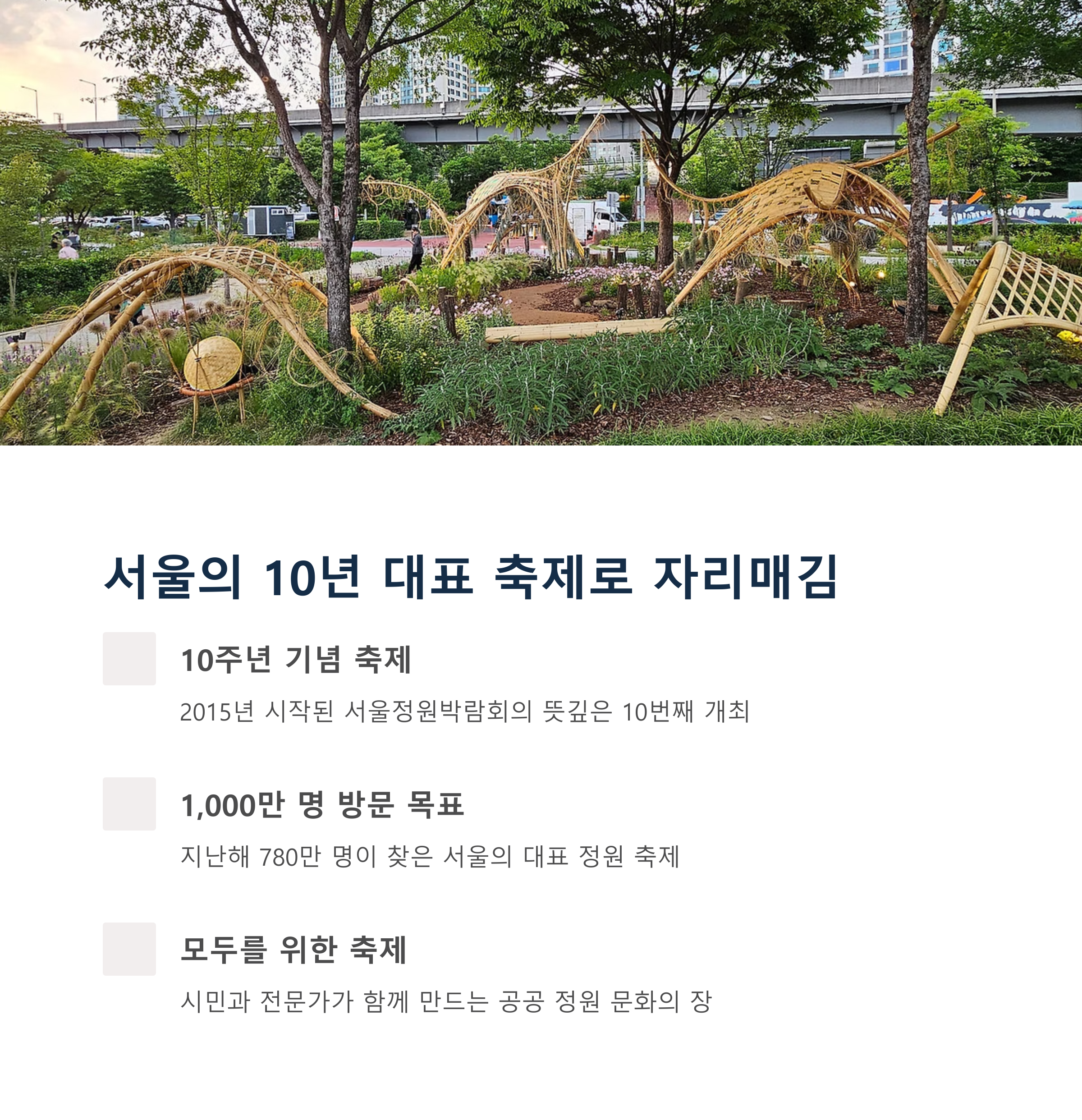 서울국제정원박람회 2025‘Seoul, Green Soul’이라는 주제 아래 도심 속 정원문화 확산과 힐링 공간 제공을 목표로 개최됩니다. 공원 산책로를 따라 100개 이상의 정원 작품이 배치되며, 각 정원은 작가정원, 시민정원, 해외초청정원 등 다양한 테마로 꾸며져 도시 속 생태와 예술을 체험할 수 있습니다. 입장료는 무료이며, 평일과 주말 모두 자유롭게 관람할 수 있습니다.