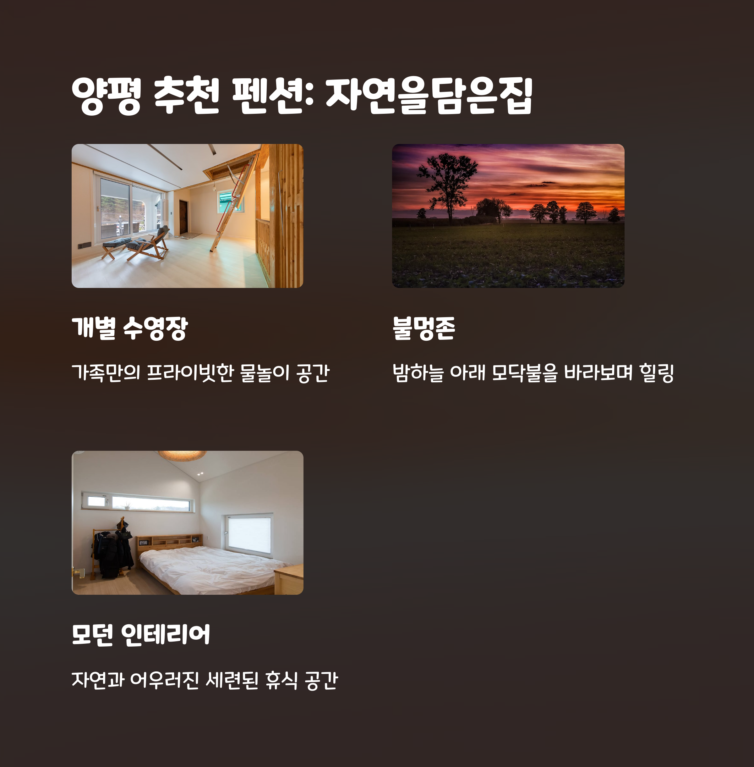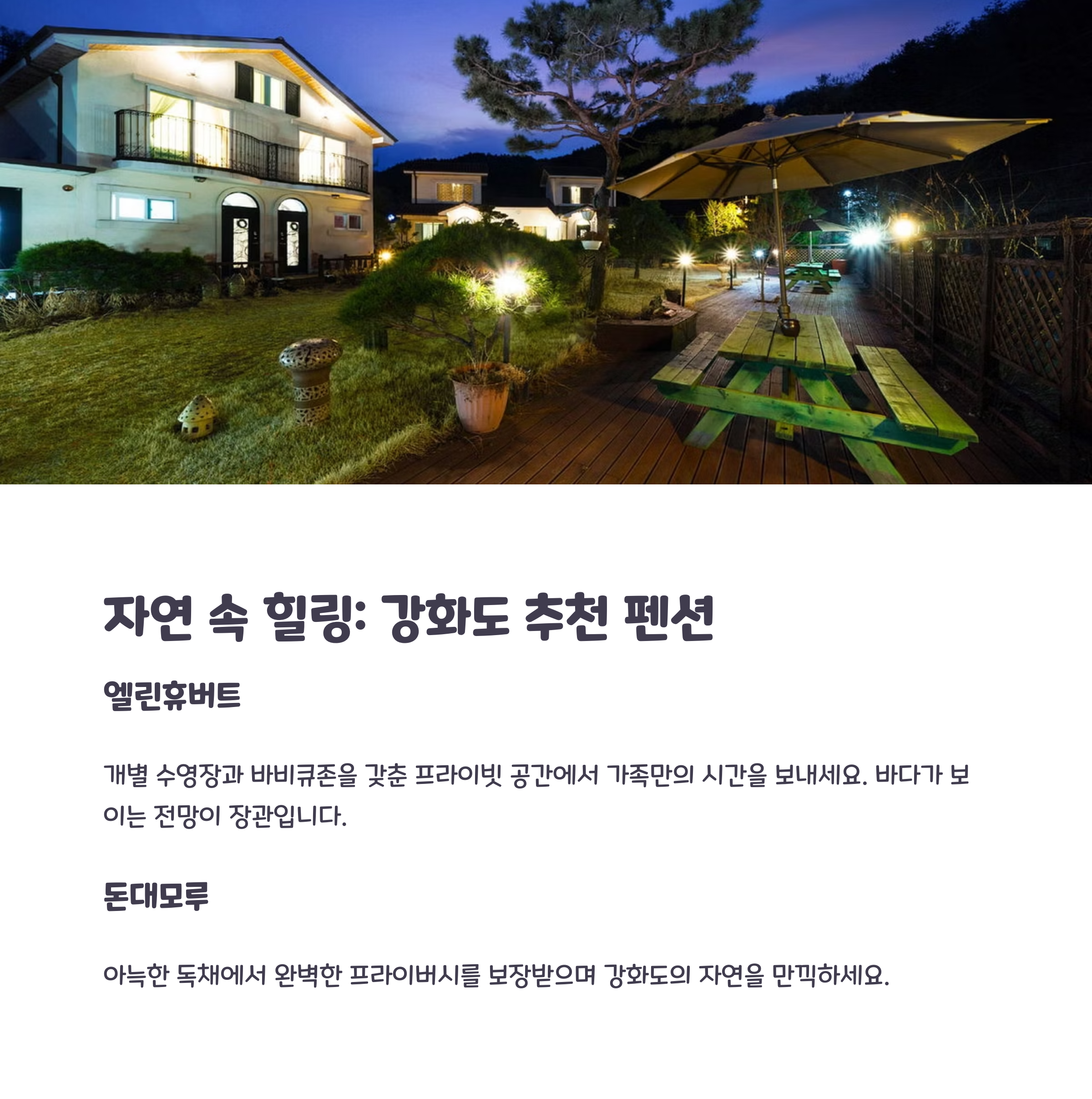 자연 속에서 프라이빗하게 머물고 싶다면 독채 펜션·풀빌라가 정답이에요. 강화 엘린휴버트는 숲과 어우러진 단독 숙소로, 아이들이 뛰어놀기 좋은 마당과 개별 바비큐장이 인기고요, 가평 뜰 독채 풀빌라는 개별 수영장과 불멍존, 양평 자연을담은집은 조용한 산속 힐링 뷰와 편안한 구조가 매력적이에요. 가족끼리만 조용하게 시간을 보내고 싶은 분들에게 적극 추천드려요.