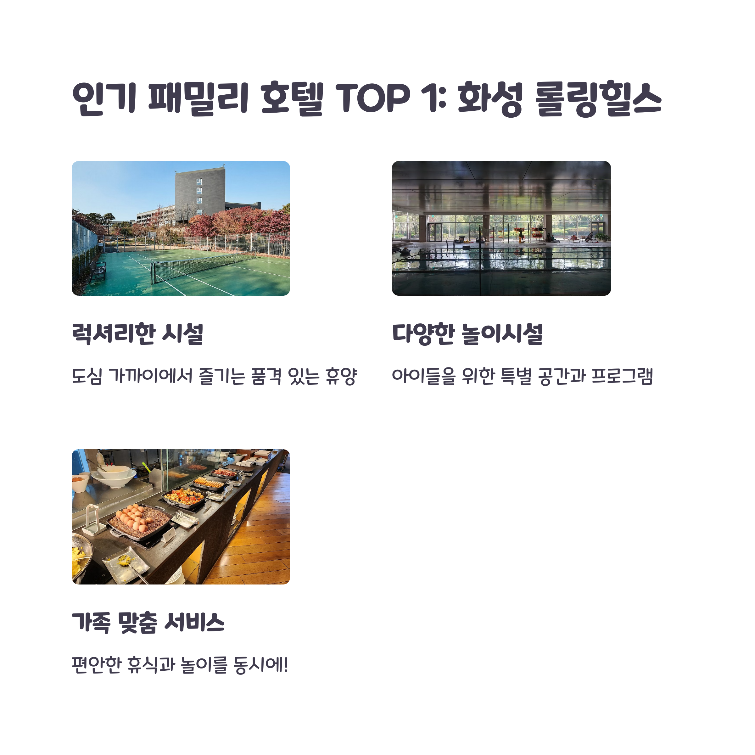 서울 근교 가족여행에 적합한 호텔로는 화성 롤링힐스 호텔이 단연 인기예요. 실내 수영장, 사우나, 어린이 놀이터, 북카페 등 다양한 부대시설과 쾌적한 객실이 가족 단위 여행객에게 최적화되어 있어요. 이천 에덴파라다이스 호텔은 유럽풍 외관과 정원이 아름답고, 광명 테이크 호텔은 키즈룸과 쿠킹 클래스, 인근 쇼핑몰과 관광지를 함께 즐길 수 있어 도심 속 호캉스형 호텔로 추천됩니다.