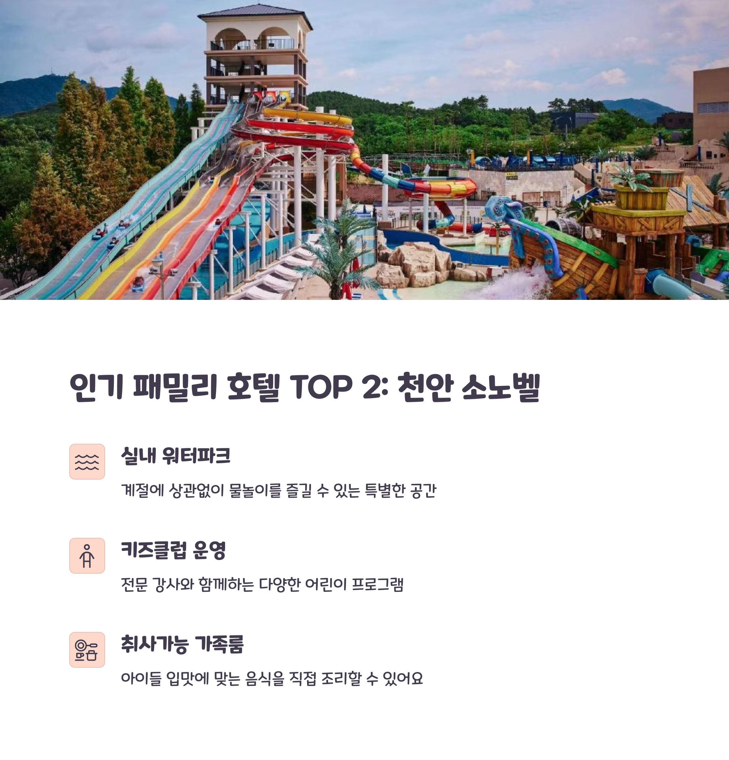 인천 그랜드 하얏트는 고급스러운 시설과 넓은 키즈룸, 여유로운 수영장 공간이 가족 고객에게 만족도가 높아요. 천안 소노벨은 워터파크, 키즈클럽, 취사가능 패밀리룸 등 아이 중심의 프로그램과 놀거리가 풍부해 호캉스 겸 나들이 장소로 제격이에요. 모든 시설이 한 공간에 모여 있어 이동 부담 없이 즐길 수 있는 점도 큰 장점입니다.