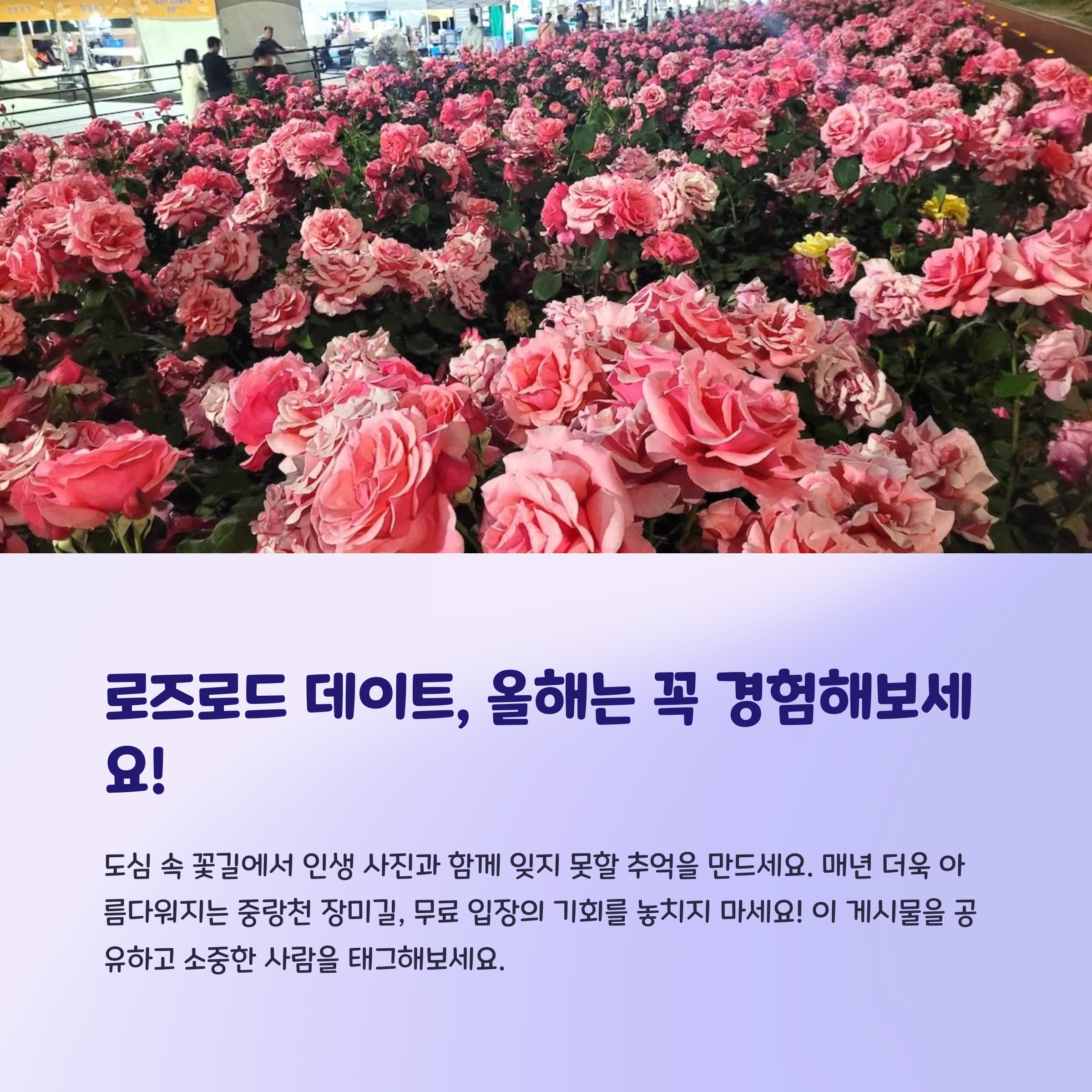 중랑천 장미길은 서울 근교에서 쉽게 만날 수 있는 자연과 감성 가득한 꽃길 데이트 장소입니다. 차량으로 드라이브를 즐긴 후 장미길을 따라 천천히 걷는 시간은 도심 속에서 찾기 힘든 여유를 선물합니다. 이번 5월, 장미가 가득한 길 위에서 잊지 못할 봄날의 추억을 만들어보세요.