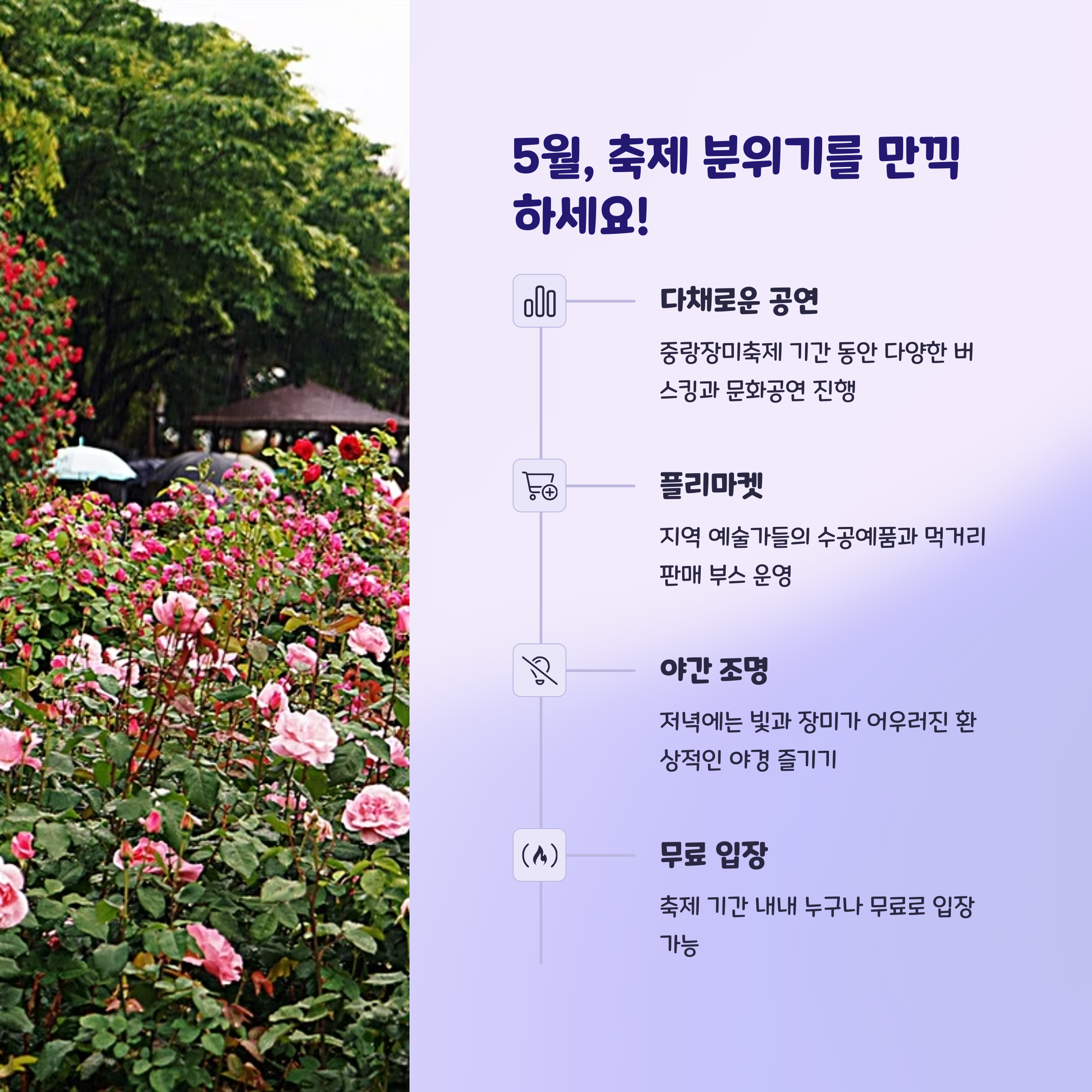 추천 시기 | 5월 중순 ~ 5월 말 (장미 만개 시기) |