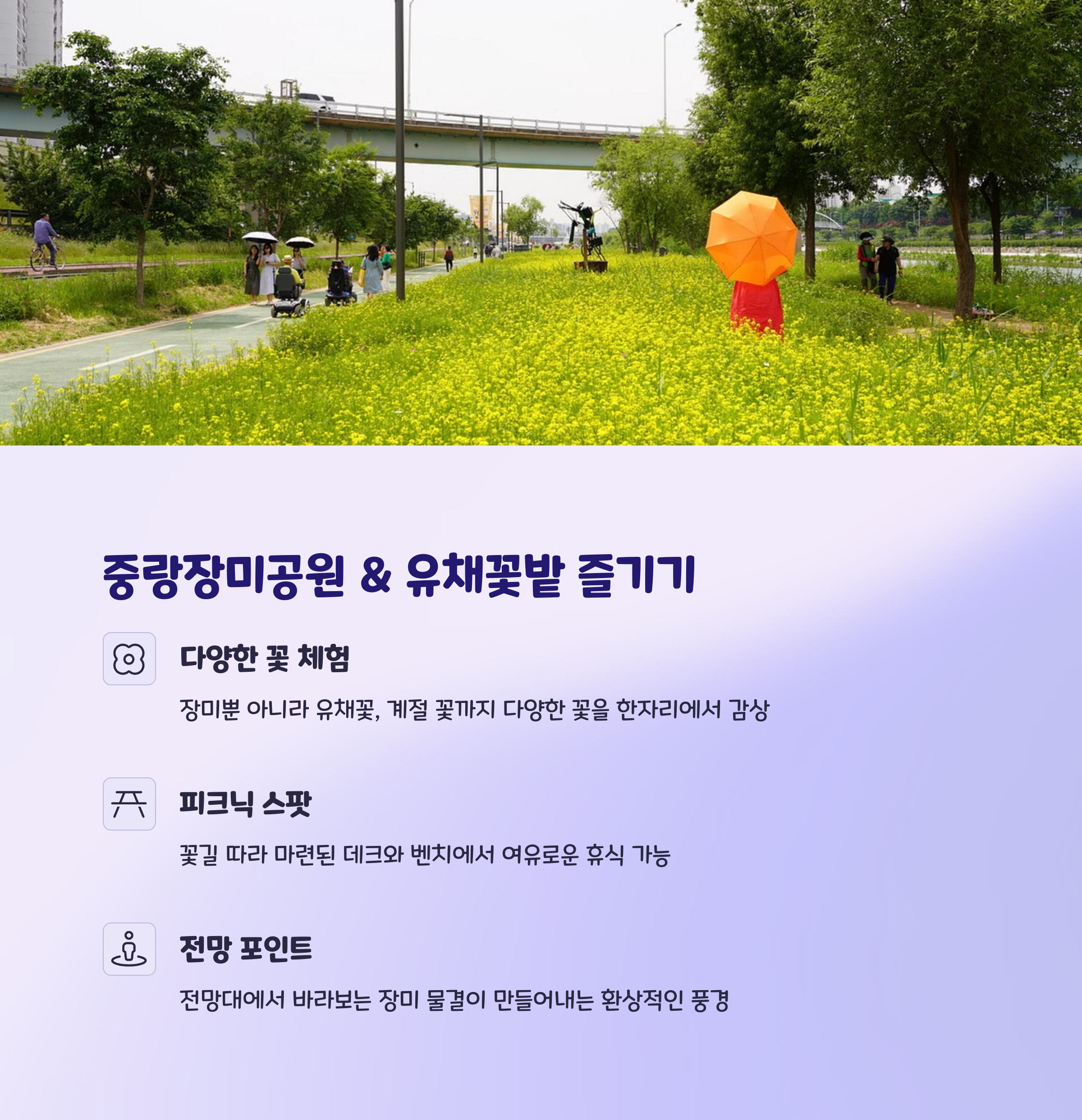 이화교~목동교 구간에는 형형색색의 장미가 이어지는 장미터널과 함께 다양한 포토존, 조형물, 벽화가 마련되어 있습니다. 특히 중랑장미공원 일대는 유채꽃밭, 사랑 조형물, 하트 프레임 등의 감성적인 공간이 많아 인생샷 촬영지로 인기를 끌고 있습니다. 중랑천의 물결과 함께 걷는 길은 도심 속 자연을 느끼기에 충분합니다.