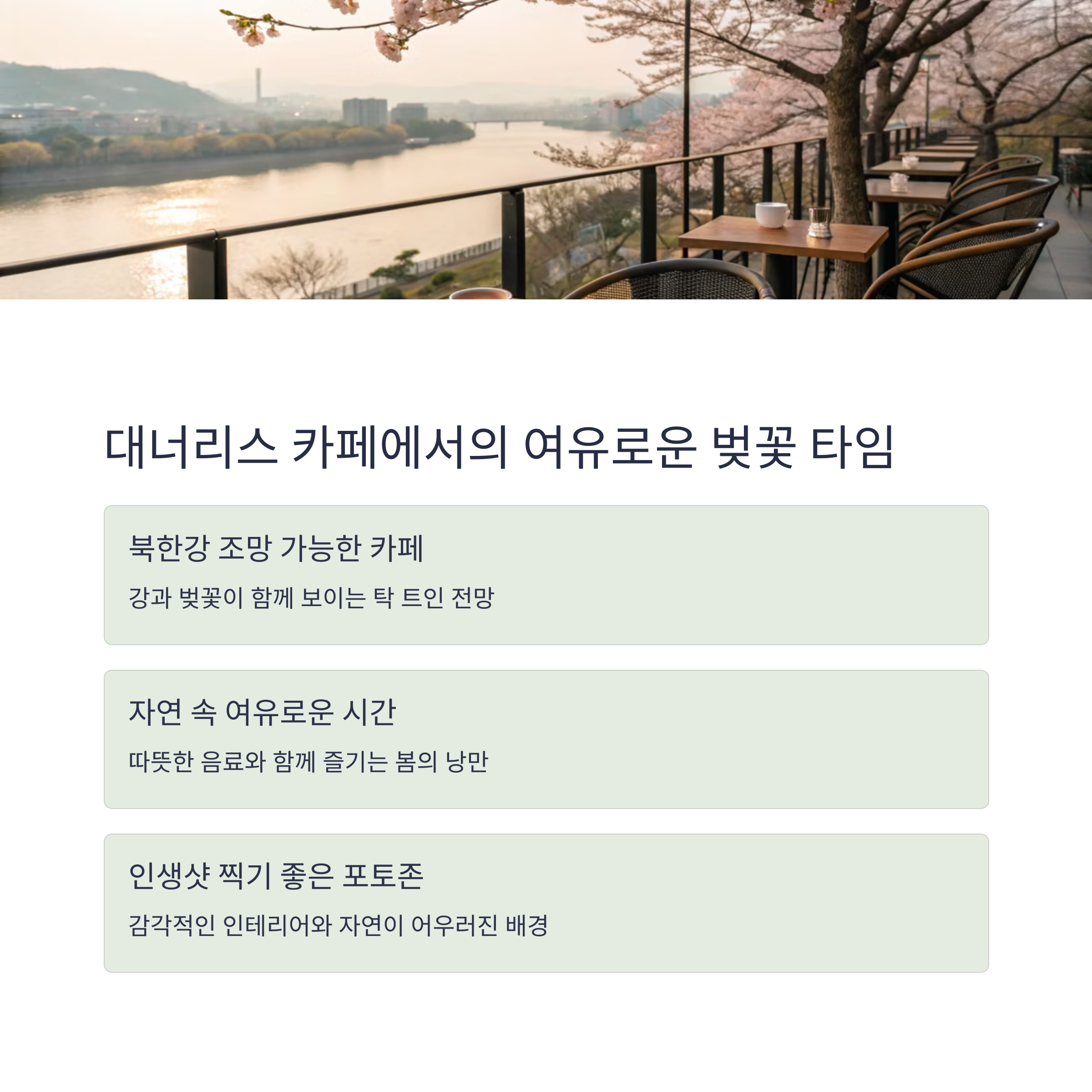 대너리스 카페는 북한강 전망이 아름다운 감성적인 카페입니다. 실내와 야외 공간이 넓어 벚꽃이 피는 봄철에는 한강을 바라보며 여유로운 시간을 보낼 수 있습니다. 다양한 음료와 디저트가 준비되어 있으며, 인생샷을 남길 수 있는 포토존도 마련되어 있습니다.
