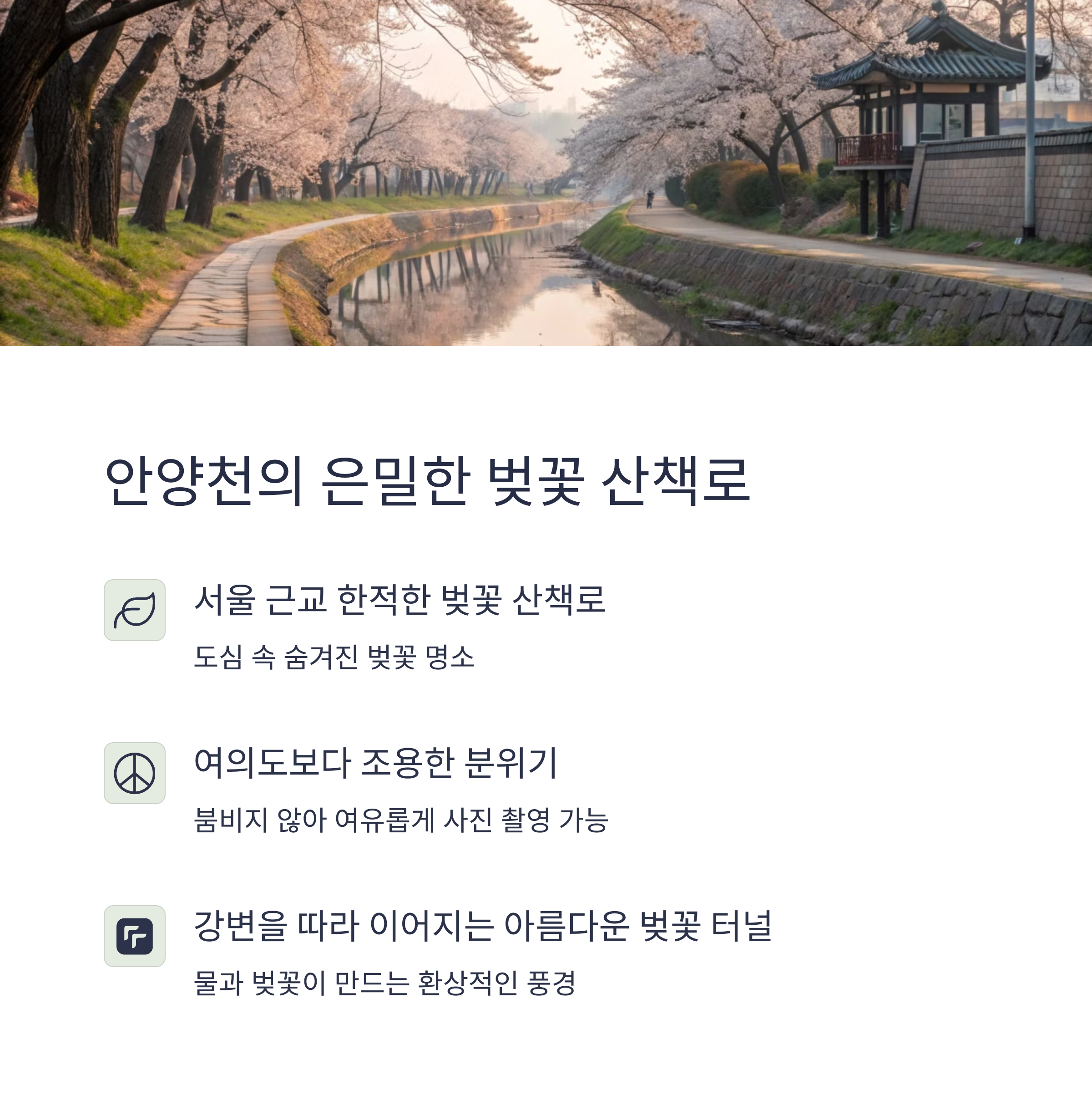 | 안양천 벚꽃길 | 한적한 분위기 속에서 벚꽃을 즐길 수 있는 명소 |