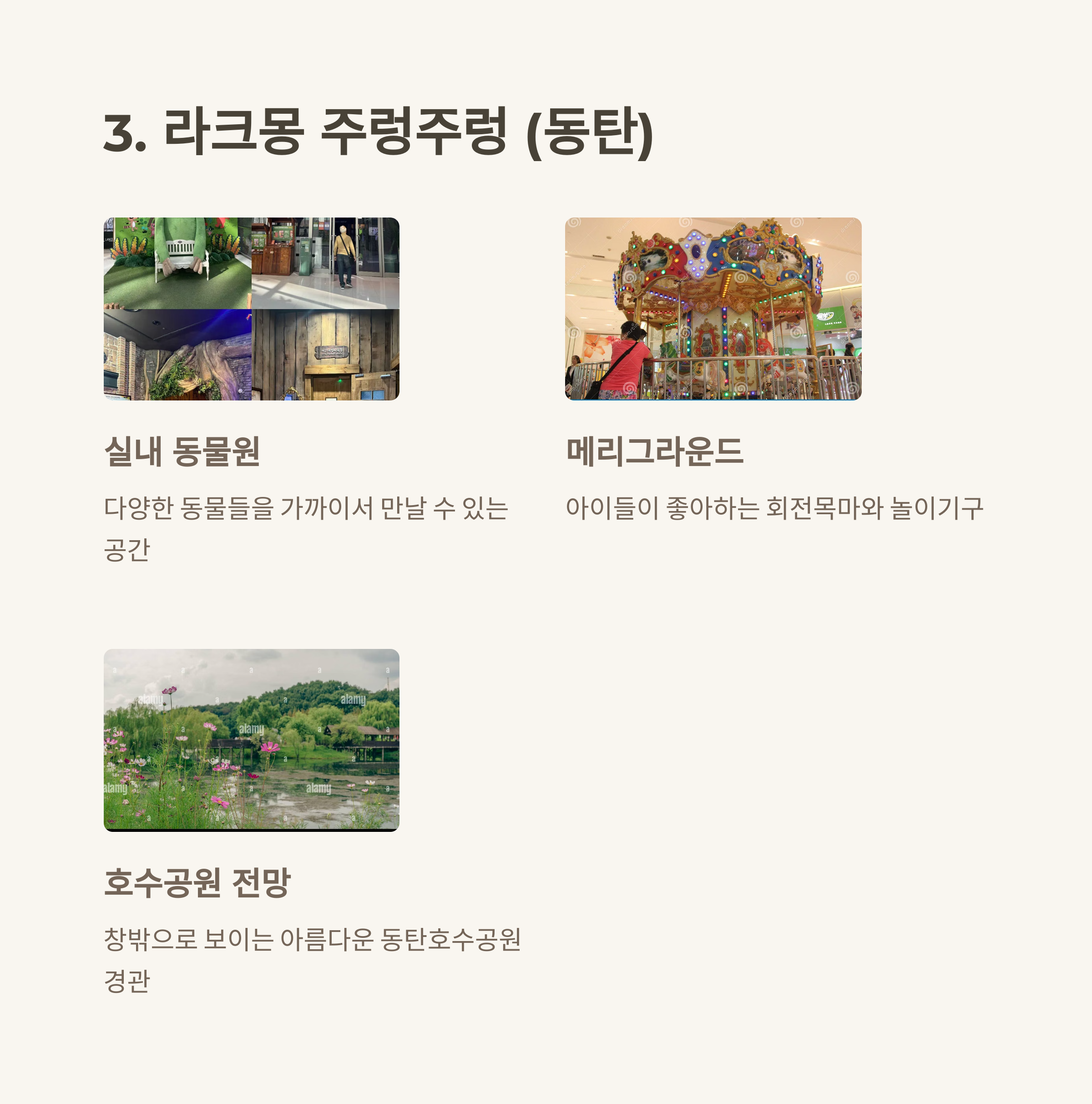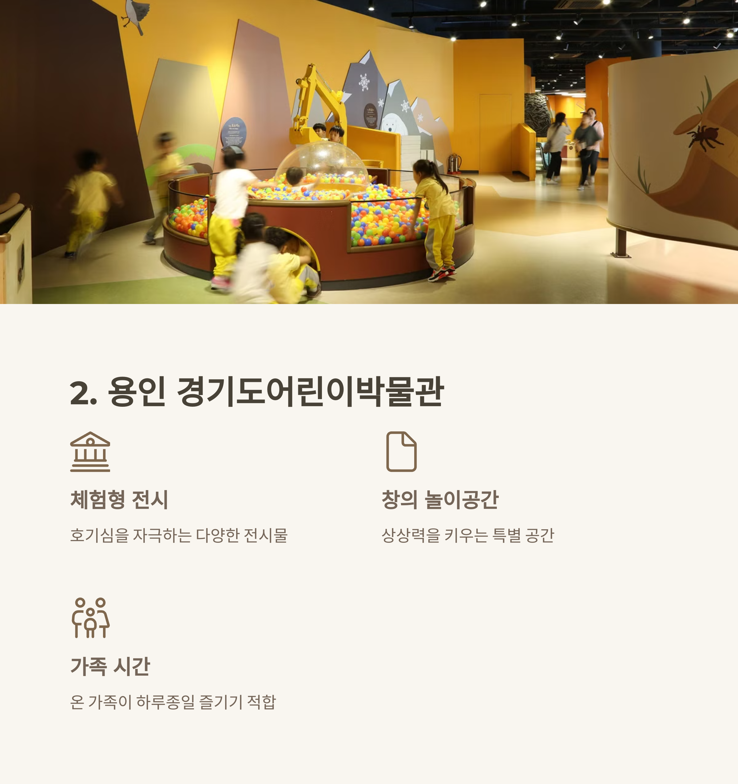 | 주말 나들이 코스로 인기 있는 장소예요. | 아이의 창의력과 사고력을 키워주는 공간. | 실내에서 안전하게 놀 수 있어 인기 많아요. |