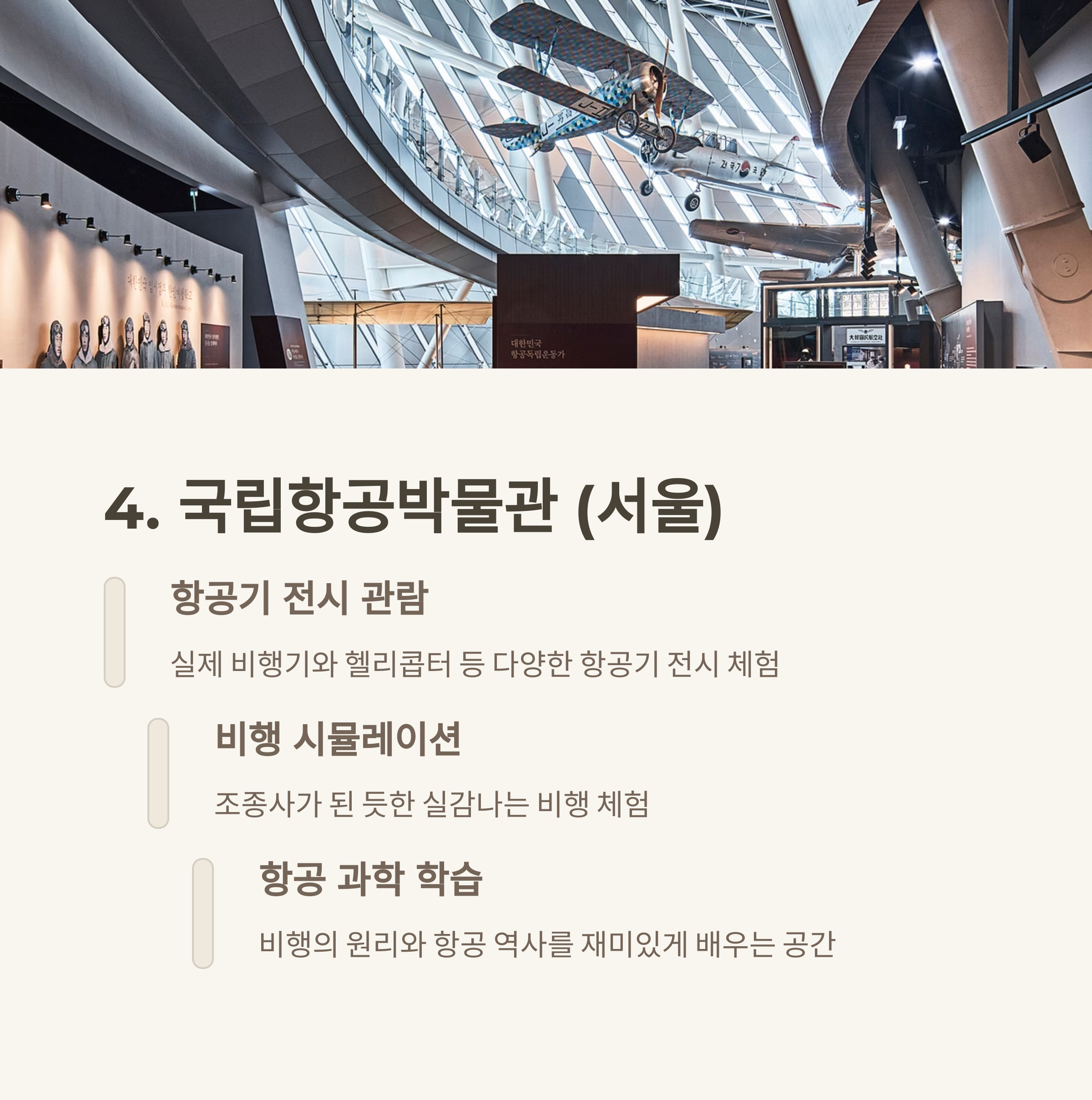 자연 테마 실내 체험과 QR코드 놀이가 가능해요. 역사와 과학, 예술을 아우르는 전시 체험 가능. 비행기·과학·식물 등 다양한 흥미를 자극해요.