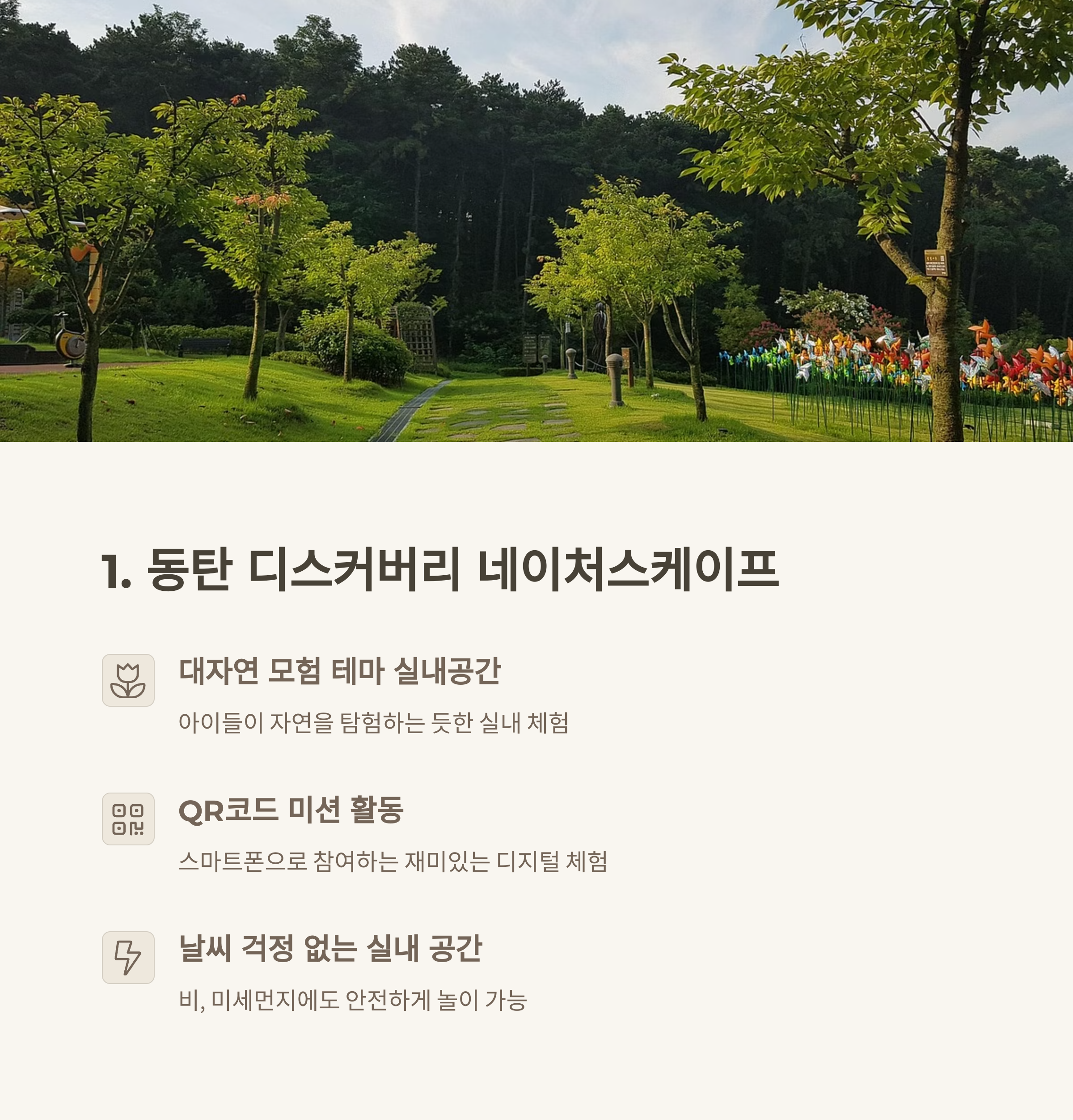 서울 근교에는 날씨에 영향을 받지 않고 아이들과 즐길 수 있는 다채로운 실내 놀이터가 많이 있습니다. 특히 어린이날처럼 특별한 날엔 안전하면서도 활동적인 공간을 찾는 부모님들이 많아지는데요. 동탄에 위치한 ‘디스커버리 네이쳐스케이프’는 대자연을 테마로 한 실내 체험 공간으로, QR코드 미션과 자연친화적인 오브제를 통해 아이들의 호기심과 상상력을 자극합니다. 탁 트인 실내 구조와 친환경 소재로 구성되어 있어 날씨와 관계없이 안전하게 놀이를 즐길 수 있는 것도 장점입니다. 이곳은 아이는 물론 보호자들도 힐링할 수 있는 친환경적 공간으로, 가족 모두에게 만족스러운 시간이 되어줄 거예요.