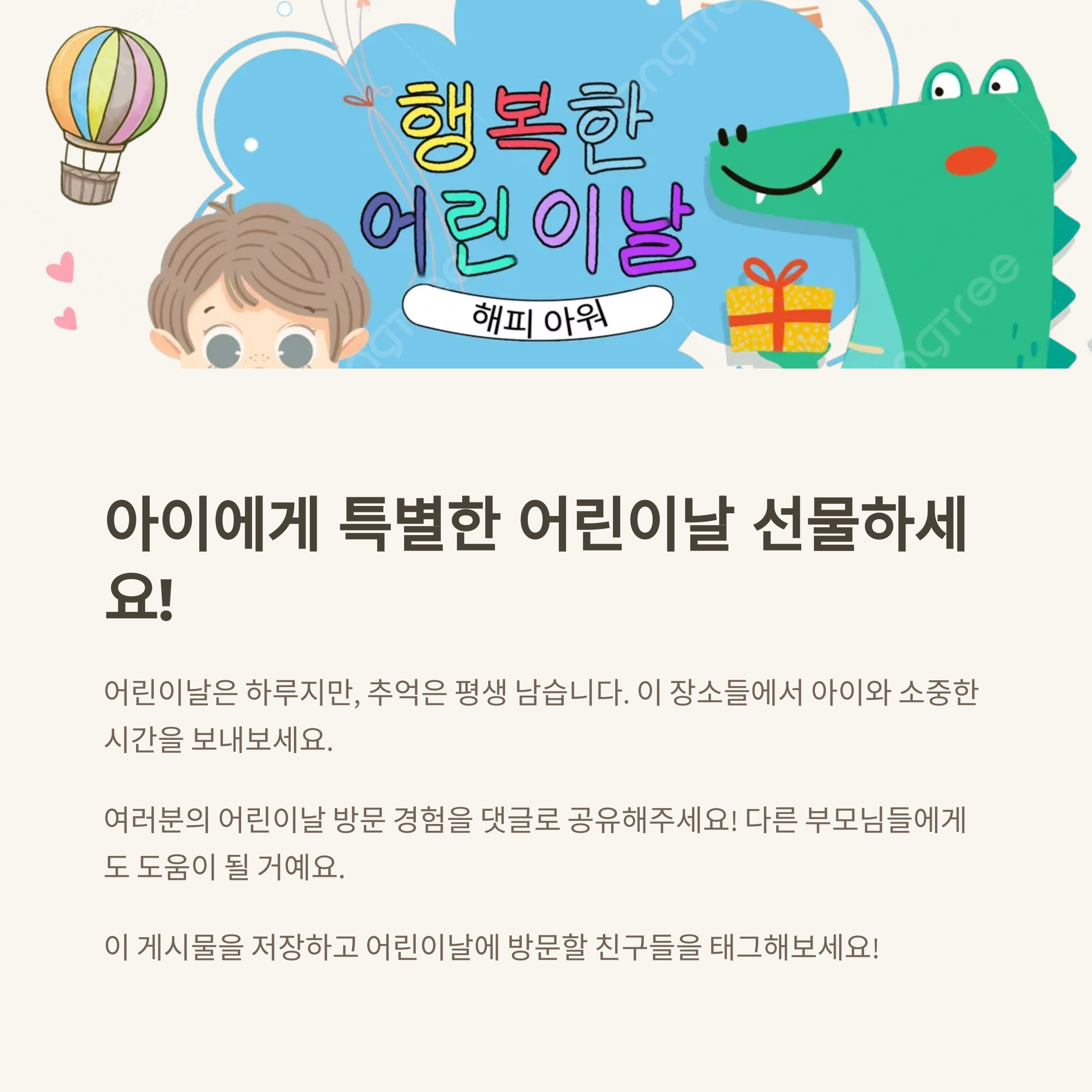 | 어린이날 실내 추천지 | 날씨와 상관없이 아이들이 신나게 놀 수 있는 공간입니다. |