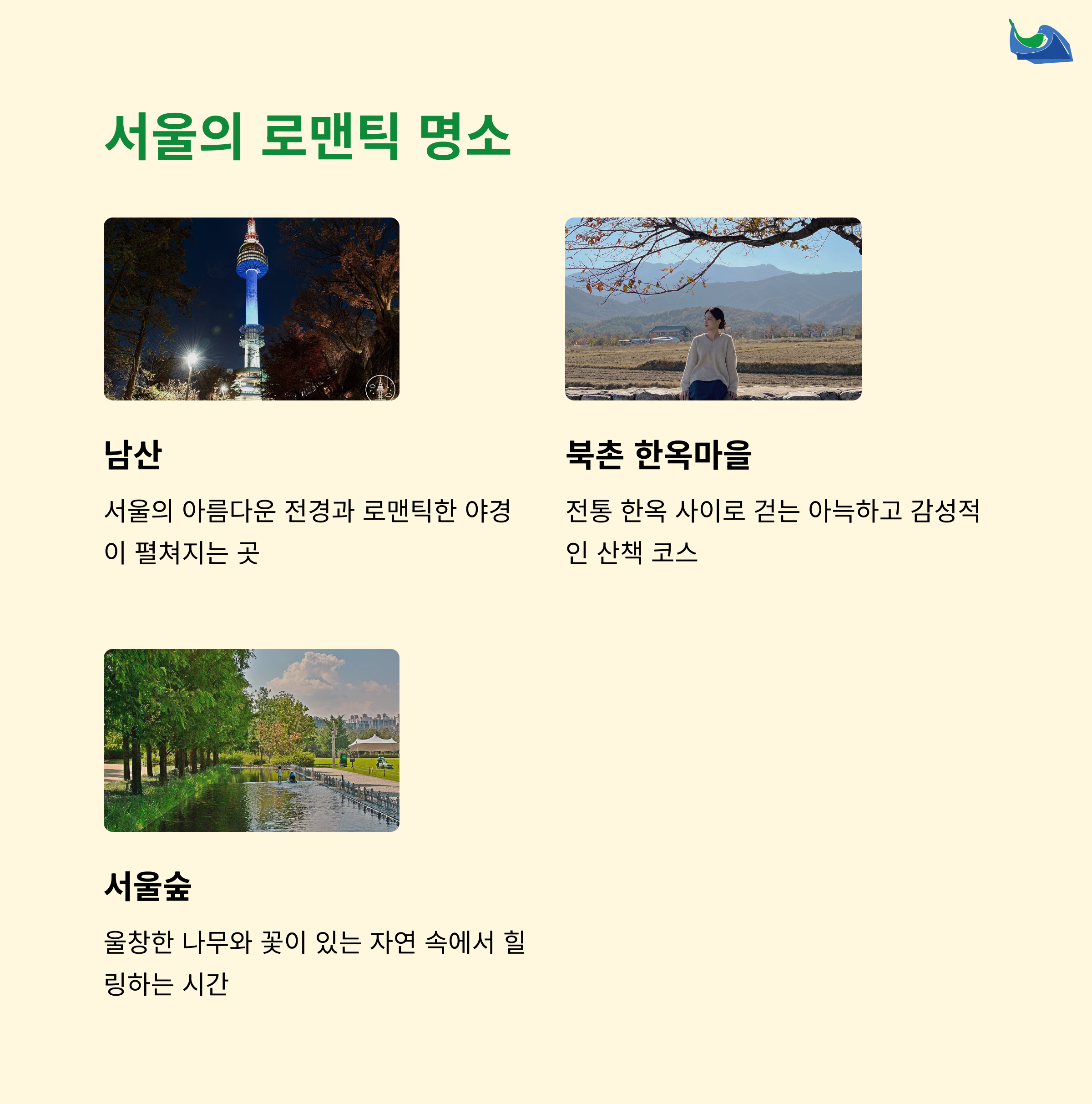 | 한옥과 골목이 어우러진 도보 산책 데이트 추천! | 분수, 캠핑존, 세빛섬까지 로맨틱한 야경이 완성돼요. | 성수, 을지로, 익선동 중심으로 핫플이 밀집돼 있어요. |