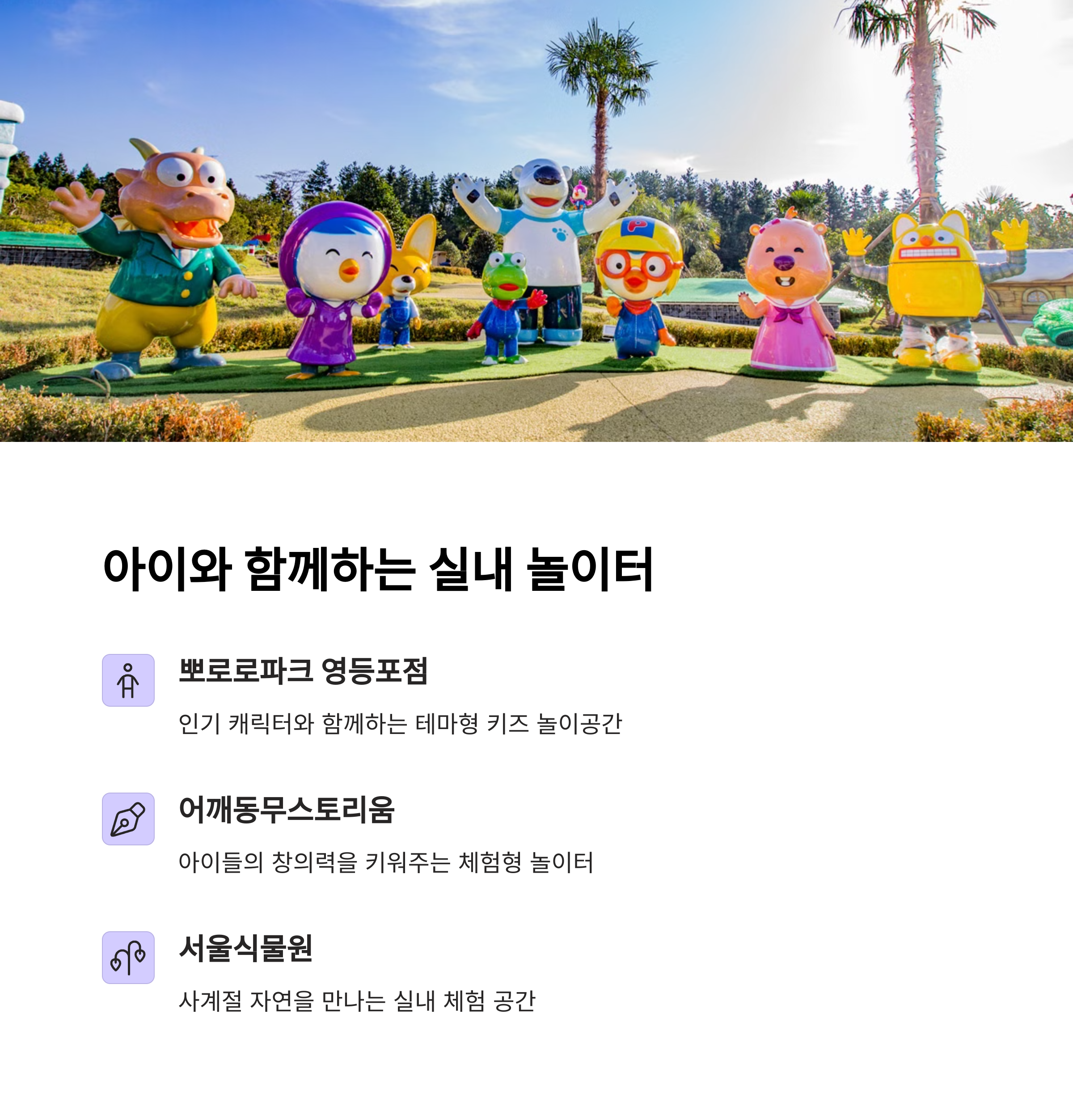 | 뽀로로파크, 어깨동무스토리움 등 어린이용 실내 공간 | K현대미술관, LP 음악 감상, 감성 카페 | 서울식물원, 창경궁 대온실 등 실내 온실 |