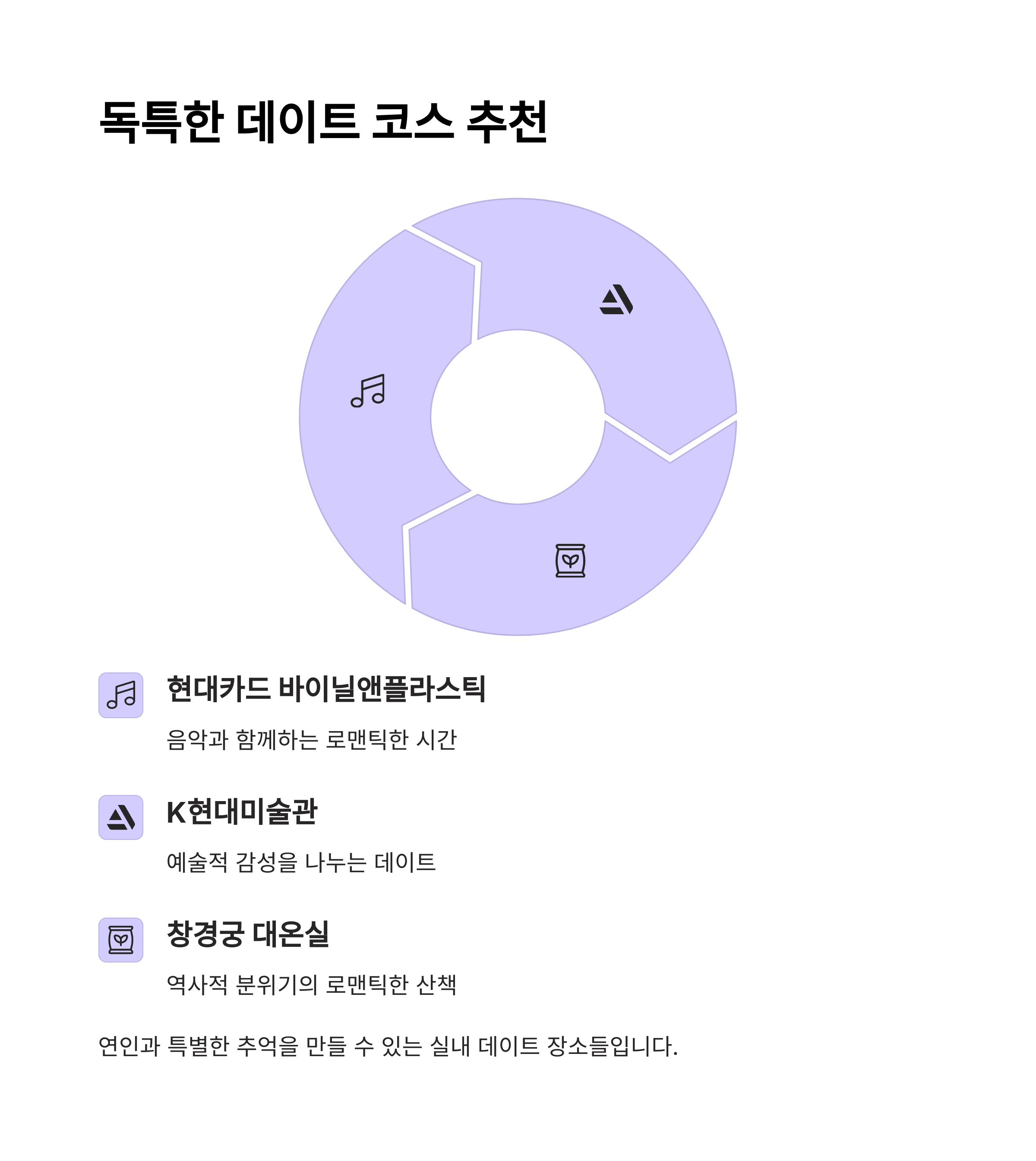 | 감성 데이트 추천 | K현대미술관, 바이닐앤플라스틱, 창경궁 대온실 |