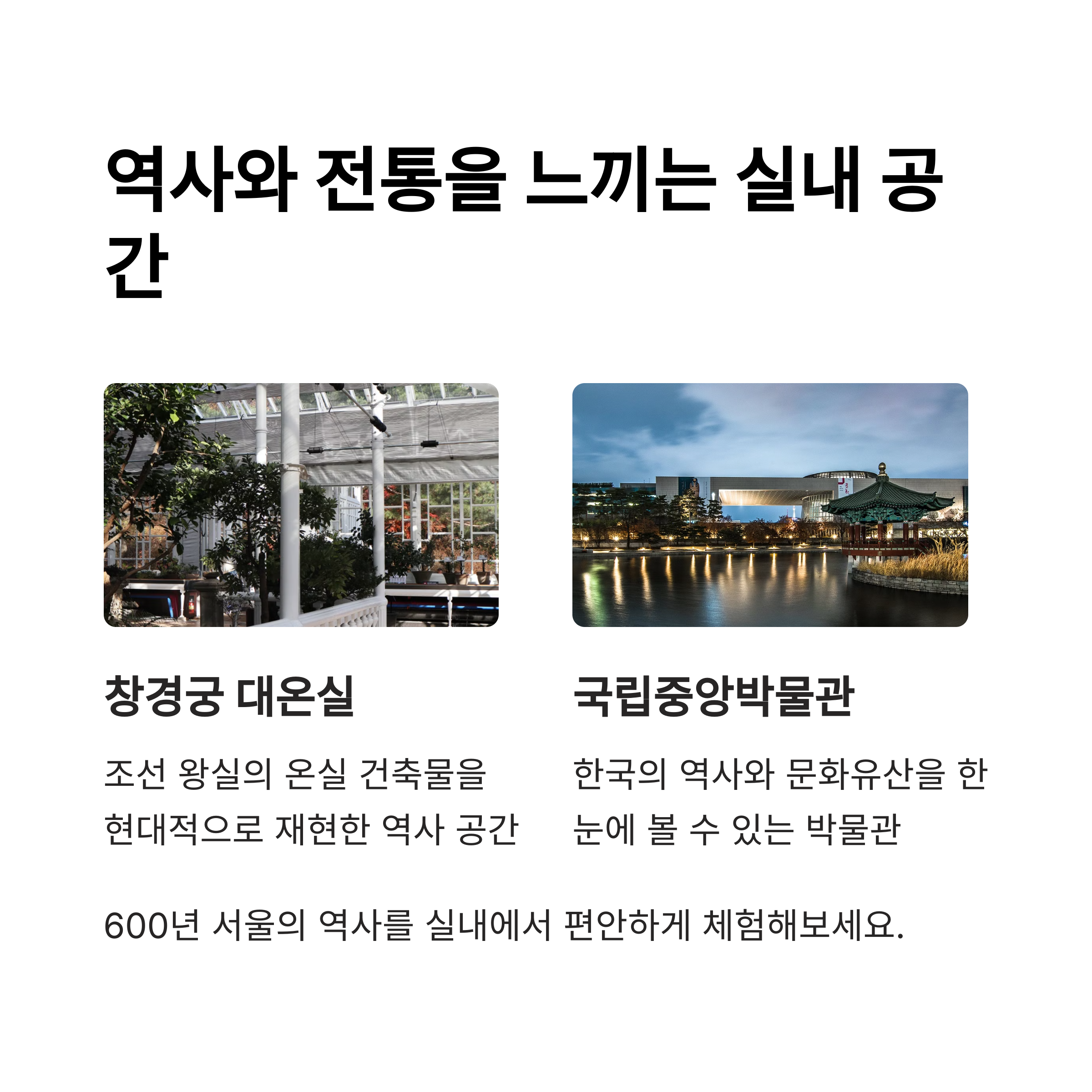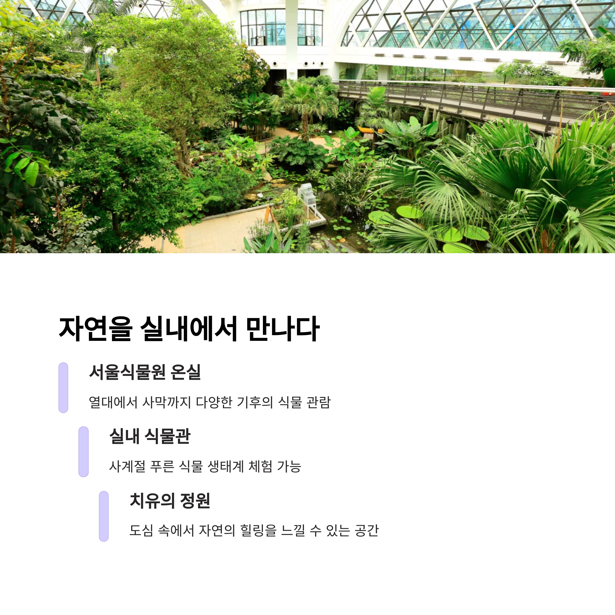 | 뽀로로파크, 어깨동무스토리움 등 어린이용 실내 공간 | K현대미술관, LP 음악 감상, 감성 카페 | 서울식물원, 창경궁 대온실 등 실내 온실 |