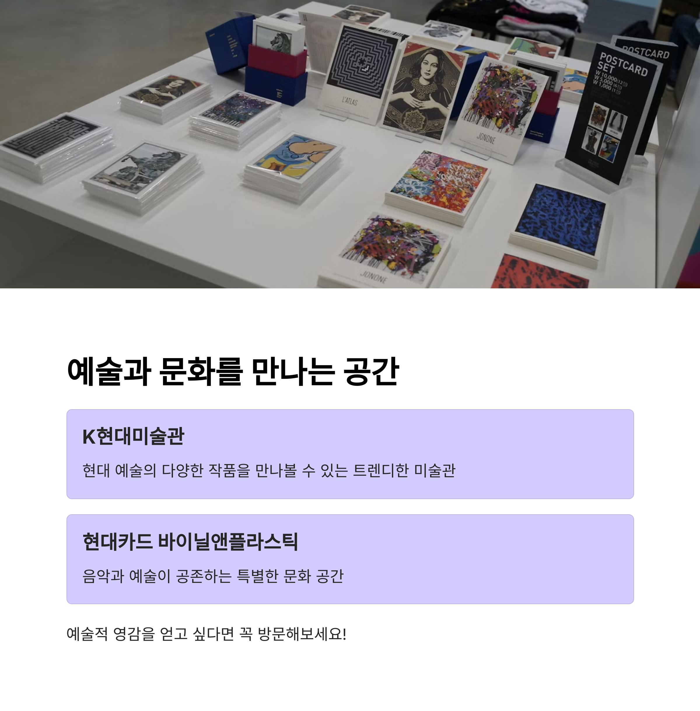 감각적인 실내 데이트 코스를 찾고 있다면 강남 K현대미술관이 제격입니다. 트렌디한 전시와 포토존이 많아 분위기 있는 시간을 보낼 수 있으며, 전시 후에는 현대카드 바이닐앤플라스틱에서 LP음악을 들으며 감성 충전을 할 수 있습니다. 음반 감상 공간과 카페가 결합된 구조라 날씨에 상관없이 하루 종일 머무르기에도 좋아요.