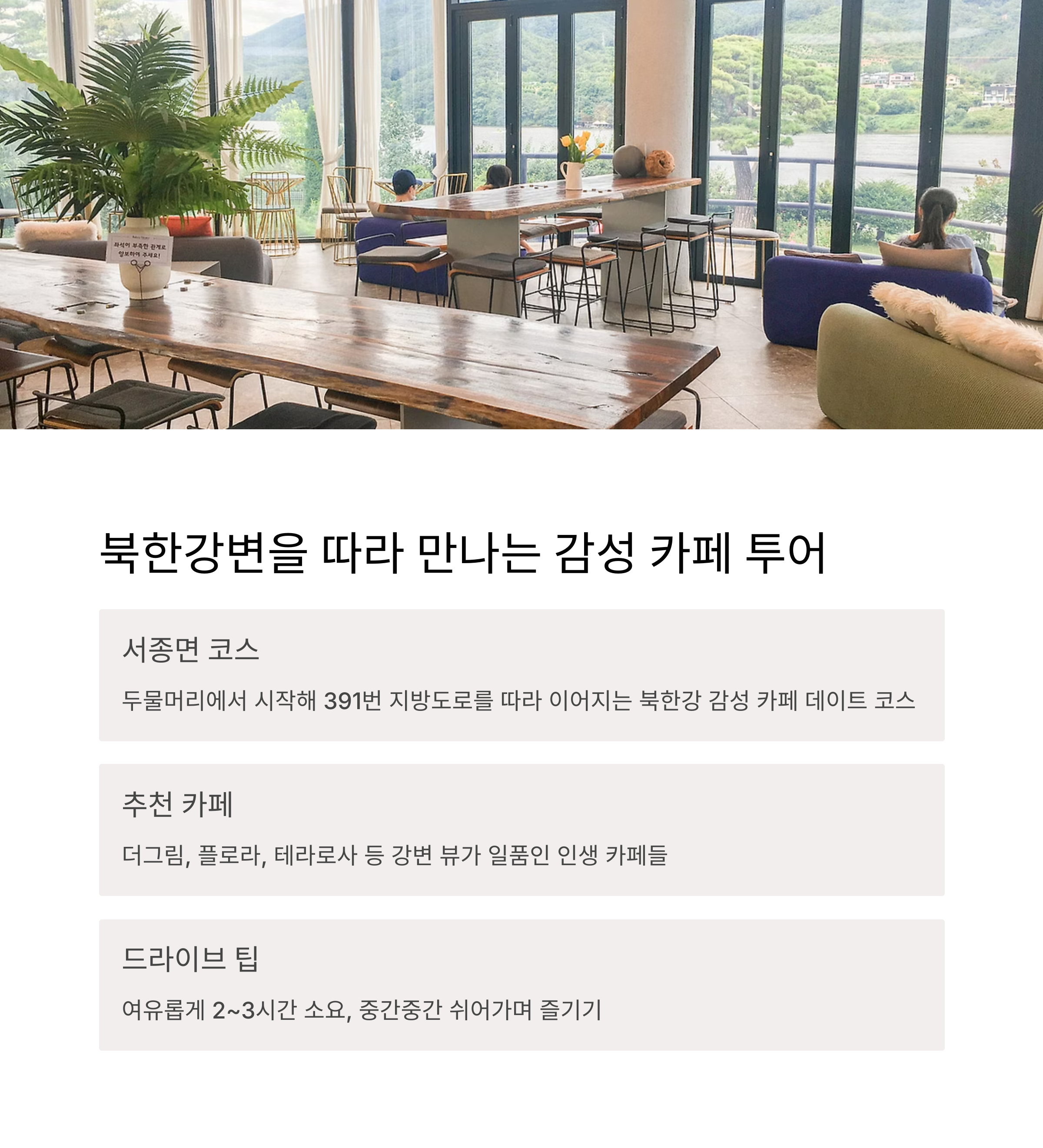 드라이브 중 잠시 쉬어가기 좋은 강변 카페들도 이 지역의 또 다른 매력입니다. ‘더그림’, ‘플로라’, ‘테라로사’ 같은 감성 카페에서는 한적한 북한강 뷰를 바라보며 여유로운 시간을 보낼 수 있습니다. 단, 주말에는 주차 공간이 협소하므로 오전 시간대 방문을 권장합니다. 북적이지 않은 시간에 찾아야 자연의 고요함을 온전히 즐길 수 있기 때문이죠. 서울에서 멀지 않지만 완전히 다른 공기와 분위기를 느낄 수 있는 두물머리는, 지금 이 순간 떠나고 싶은 드라이브 코스입니다.