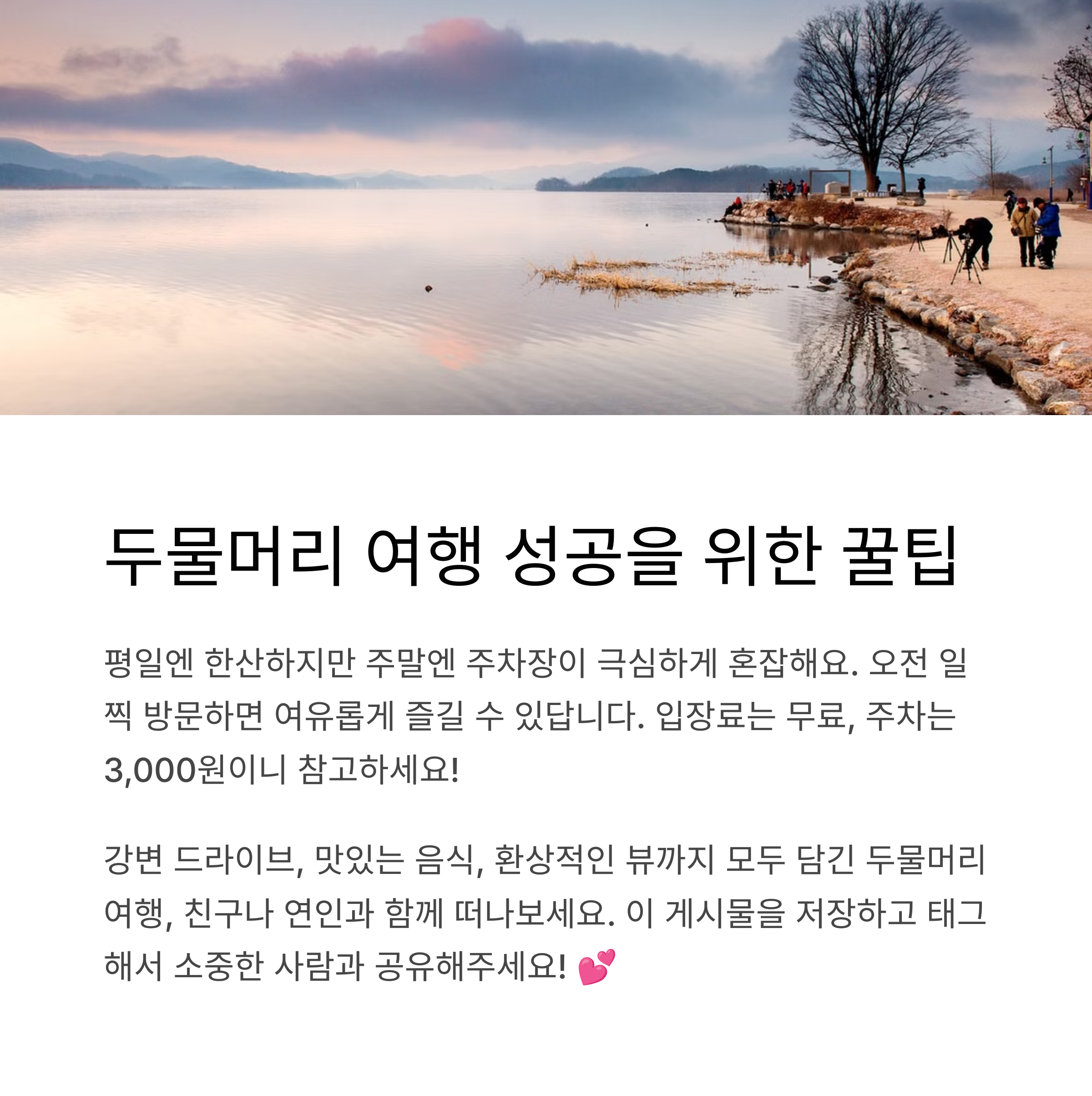 두물머리 드라이브 코스 중 추천하고 싶은 맛집이나 카페가 있다면 댓글로 공유해주세요. 실제 방문 후기가 다른 분들께도 큰 도움이 될 수 있습니다. 여러분만의 숨은 명소도 환영합니다!