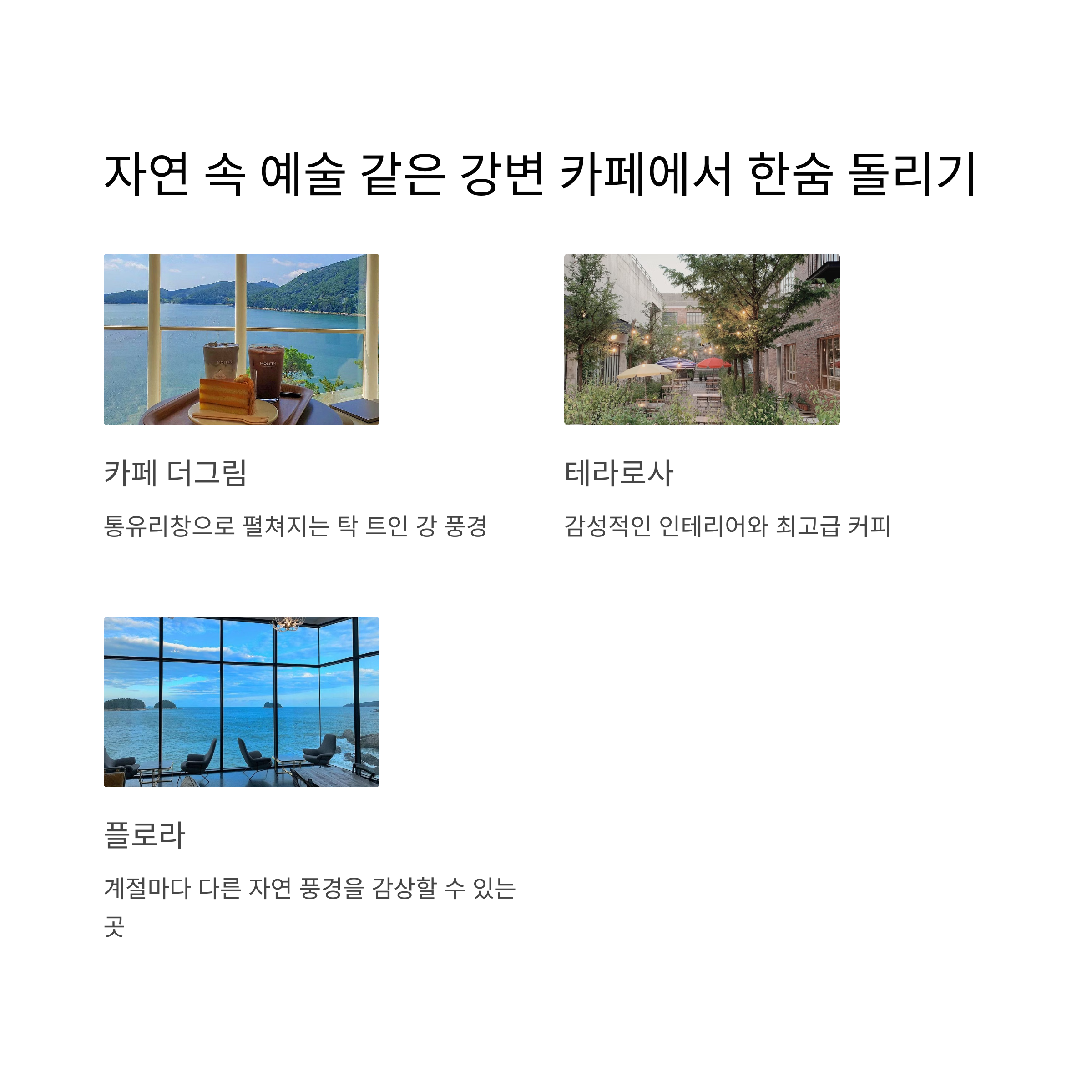 ‘더그림’, ‘플로라’, ‘테라로사’는 강변 뷰와 감성 인테리어로 인기가 높습니다. 자연 풍경을 바라보며 여유로운 휴식을 즐기기에 좋습니다.