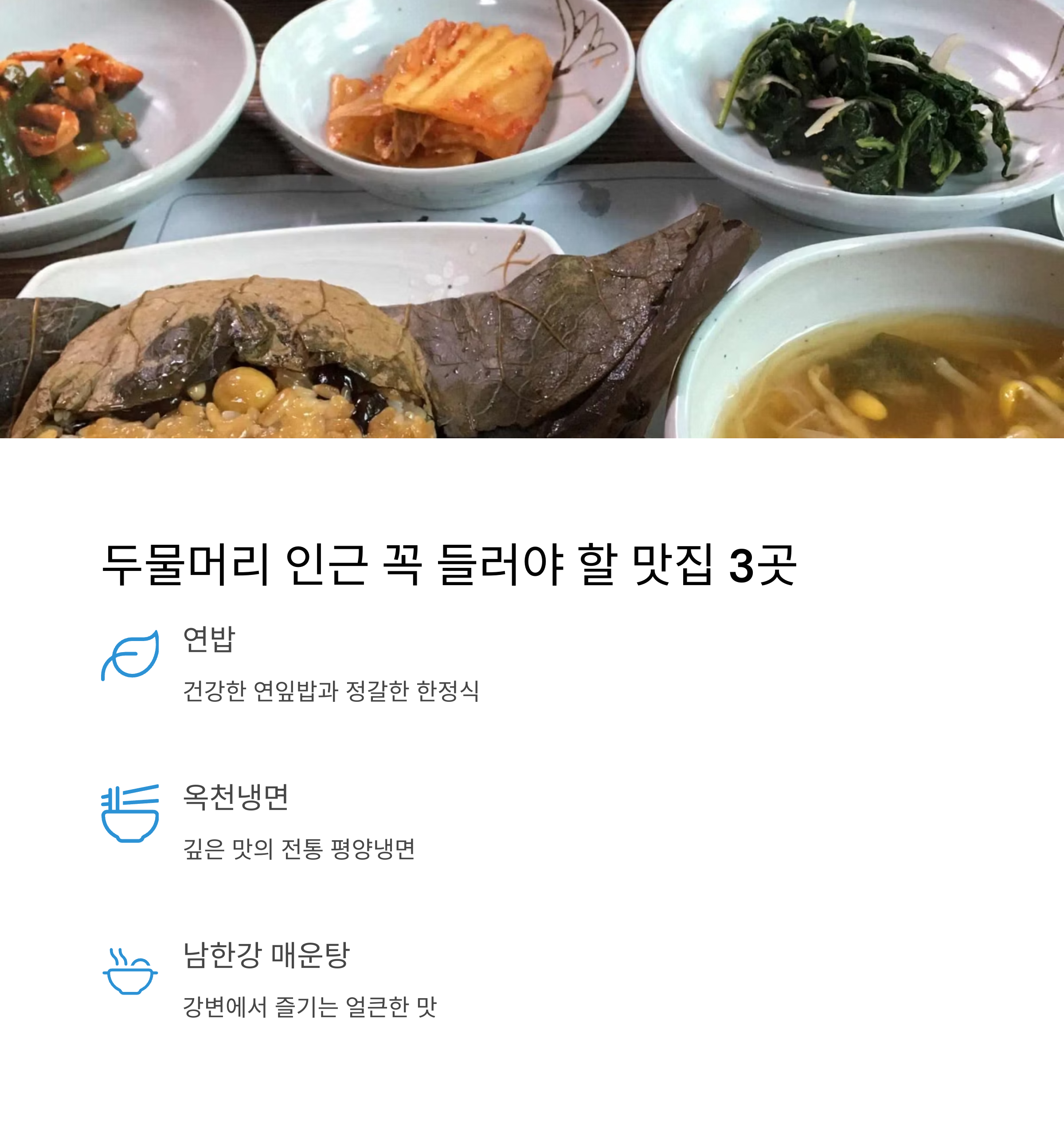| 추천 맛집 | 연잎밥 전문 ‘연밥’, 평양냉면 ‘옥천냉면’, 매운탕 맛집 |