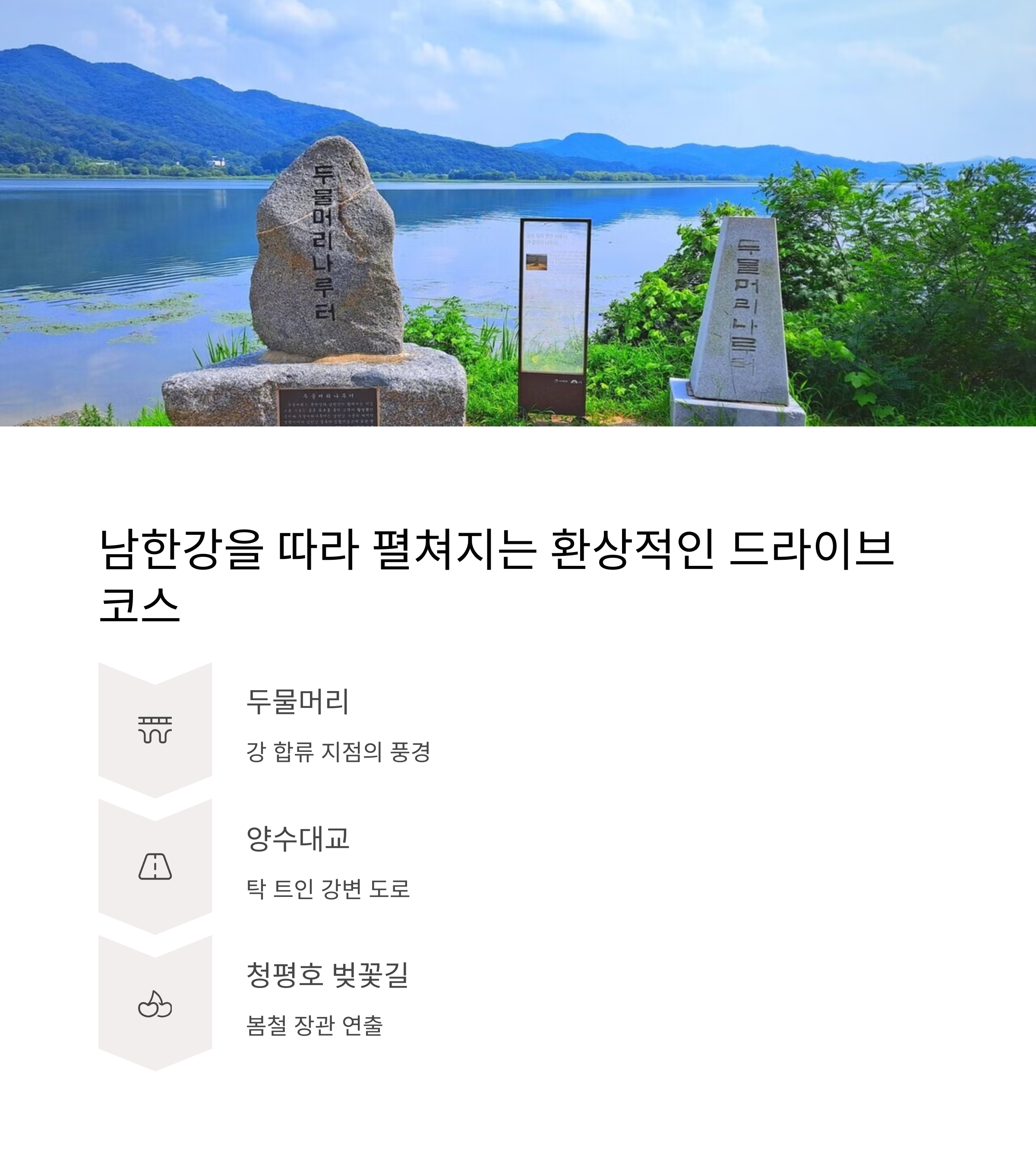 서울 근교에서 자연과 여유를 동시에 느낄 수 있는 두물머리는 사계절 내내 다양한 풍경을 감상할 수 있는 명소입니다. 드라이브 코스로도 손꼽히는 이 지역은 남한강을 따라 시원하게 뻗은 도로가 인상적이며, 도심을 벗어난 기분 좋은 자유로움을 선사합니다. 특히 양수대교를 거쳐 청평호까지 이어지는 루트는 봄철 벚꽃 드라이브로 유명해 많은 연인들과 가족 단위 나들이객들의 사랑을 받고 있죠. 자연을 따라 흐르듯 달리는 이 길은 그 자체만으로도 힐링이 되는 여정입니다.
