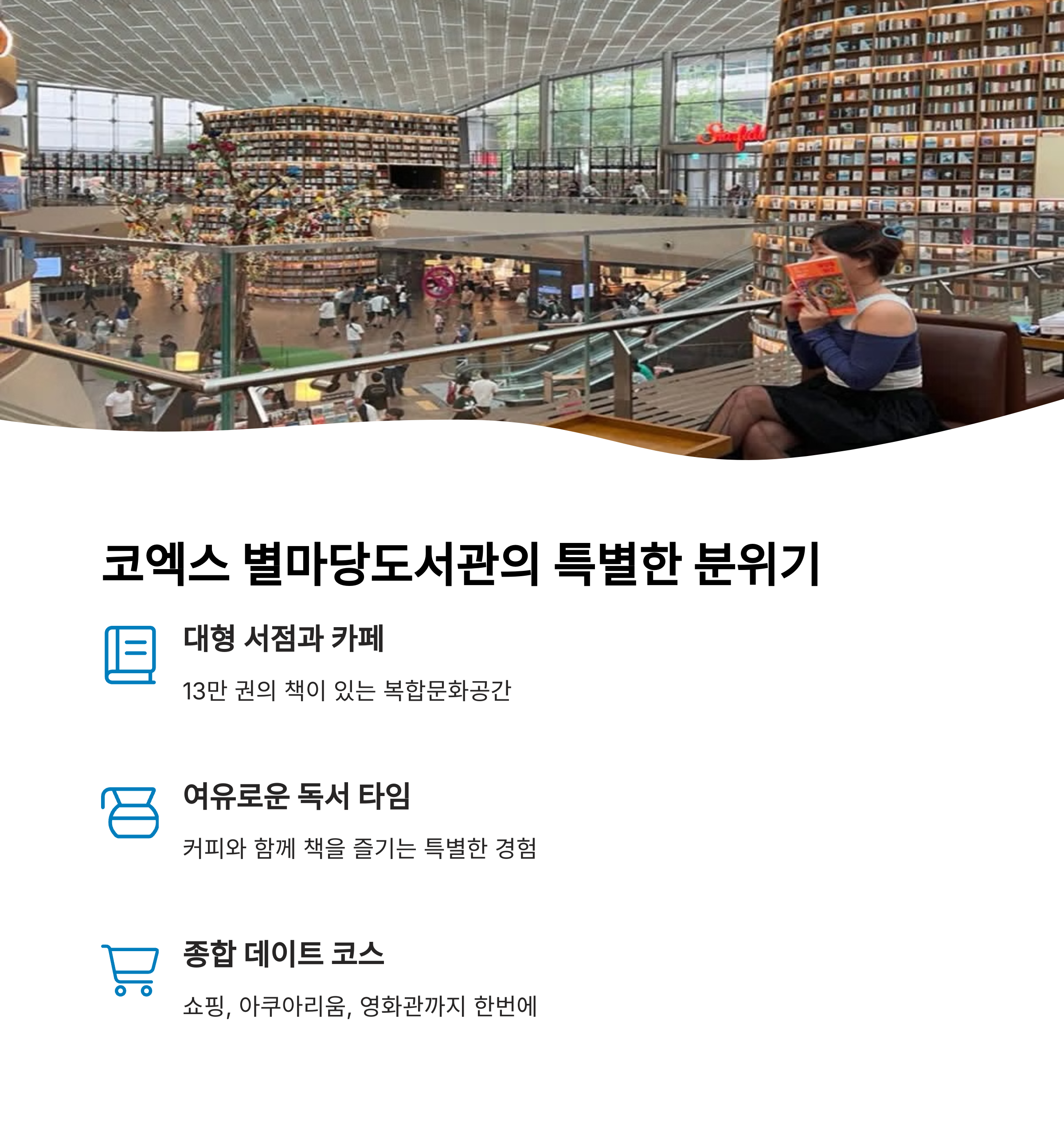 책과 커피를 함께 즐기고 싶다면 별마당도서관을 추천해요. 코엑스에 위치한 이곳은 천장까지 이어진 책장과 따뜻한 조명으로 인생샷 명소로도 유명하고, 도서관 내부와 연결된 카페에서 여유로운 시간을 보내기 좋습니다. 가까운 스타필드, 메가박스 등과 연계한 데이트 코스로도 좋아요. 도심 한복판에서 차분하게 책을 읽으며 휴식을 즐기는 데이트, 색다르지 않나요?