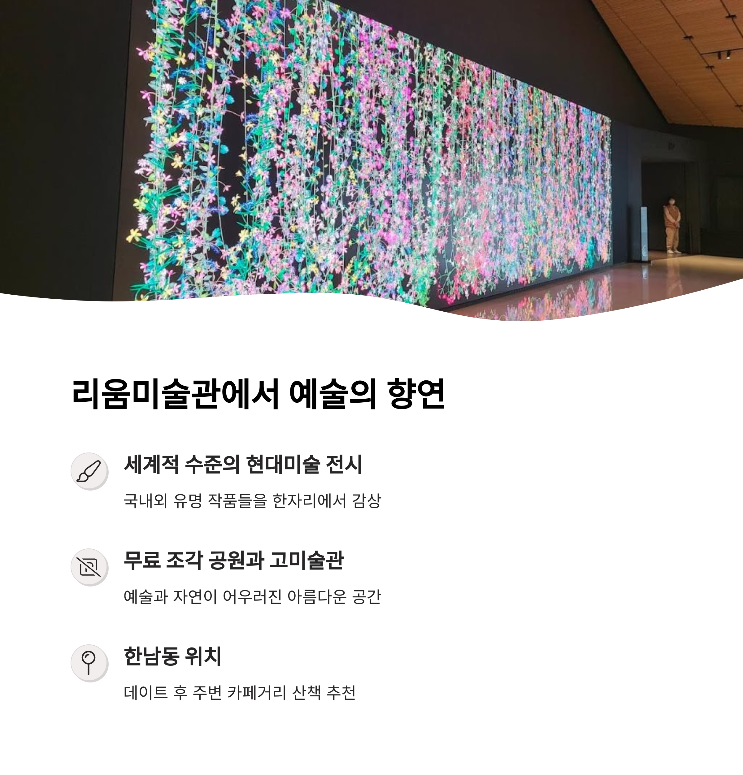 리움, 시립미술관, 국립중앙박물관 등에서 예술 감상 데이트 서촌, 연남, 성수 감성 골목과 전시형 카페 조합 인기 날씨에 구애받지 않는 실내 데이트 코스로 딱 좋아요