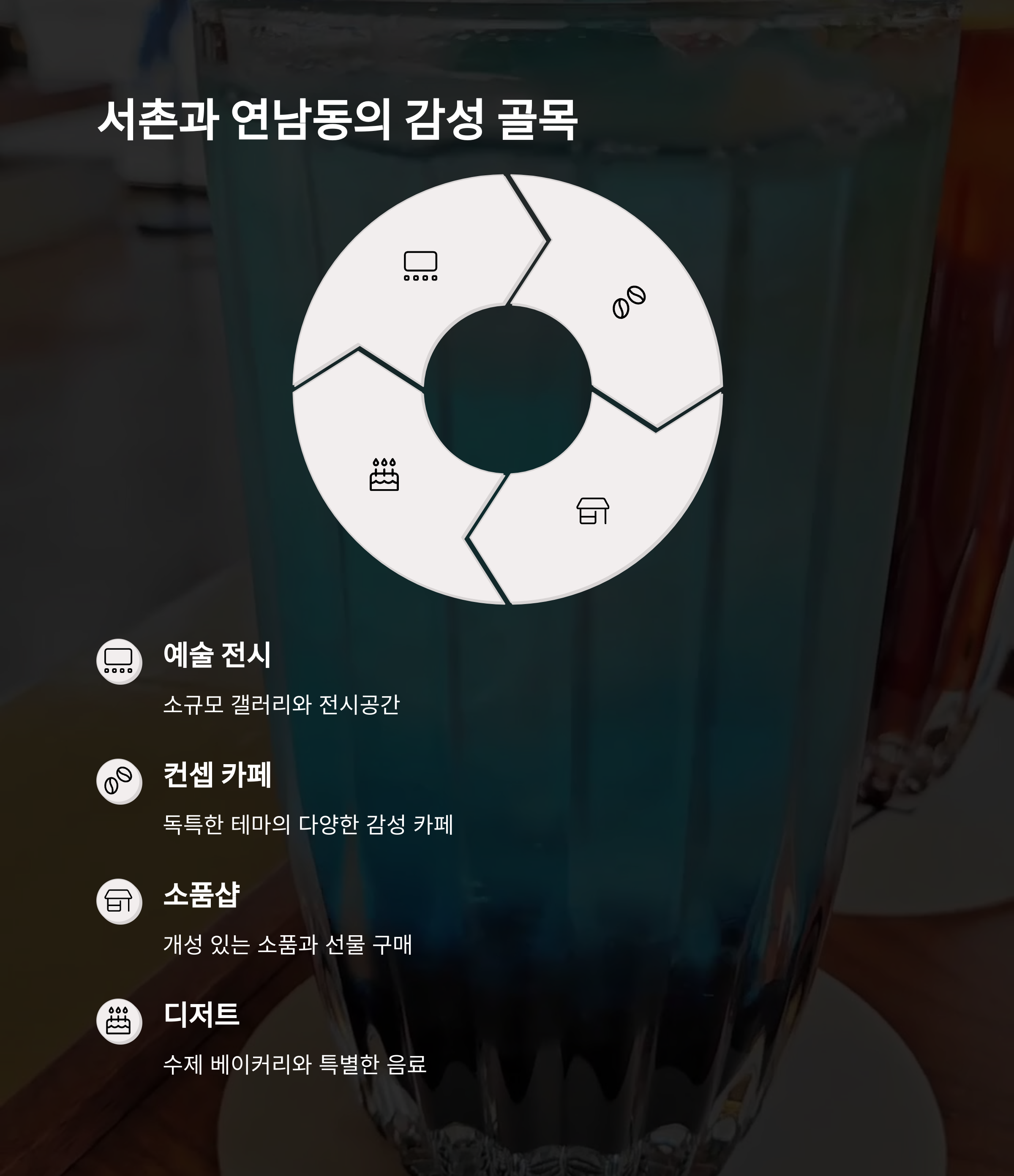 서촌, 연남동, 성수동은 실내외 감성 공간이 자연스럽게 섞여 있는 데이트 명소예요. 골목 곳곳에 소품샵, 독립서점, 전시형 카페가 많아 걷는 재미와 보는 즐거움을 동시에 느낄 수 있죠. 특히 합정의 카페 꼼마, 동대문 DDP의 루프트커피는 자체 전시와 함께 커피를 즐길 수 있어 실내에서도 특별한 분위기를 연출할 수 있어요. 날씨와 상관없이 안정적인 데이트를 원한다면 이 코스들 꼭 참고해보세요!