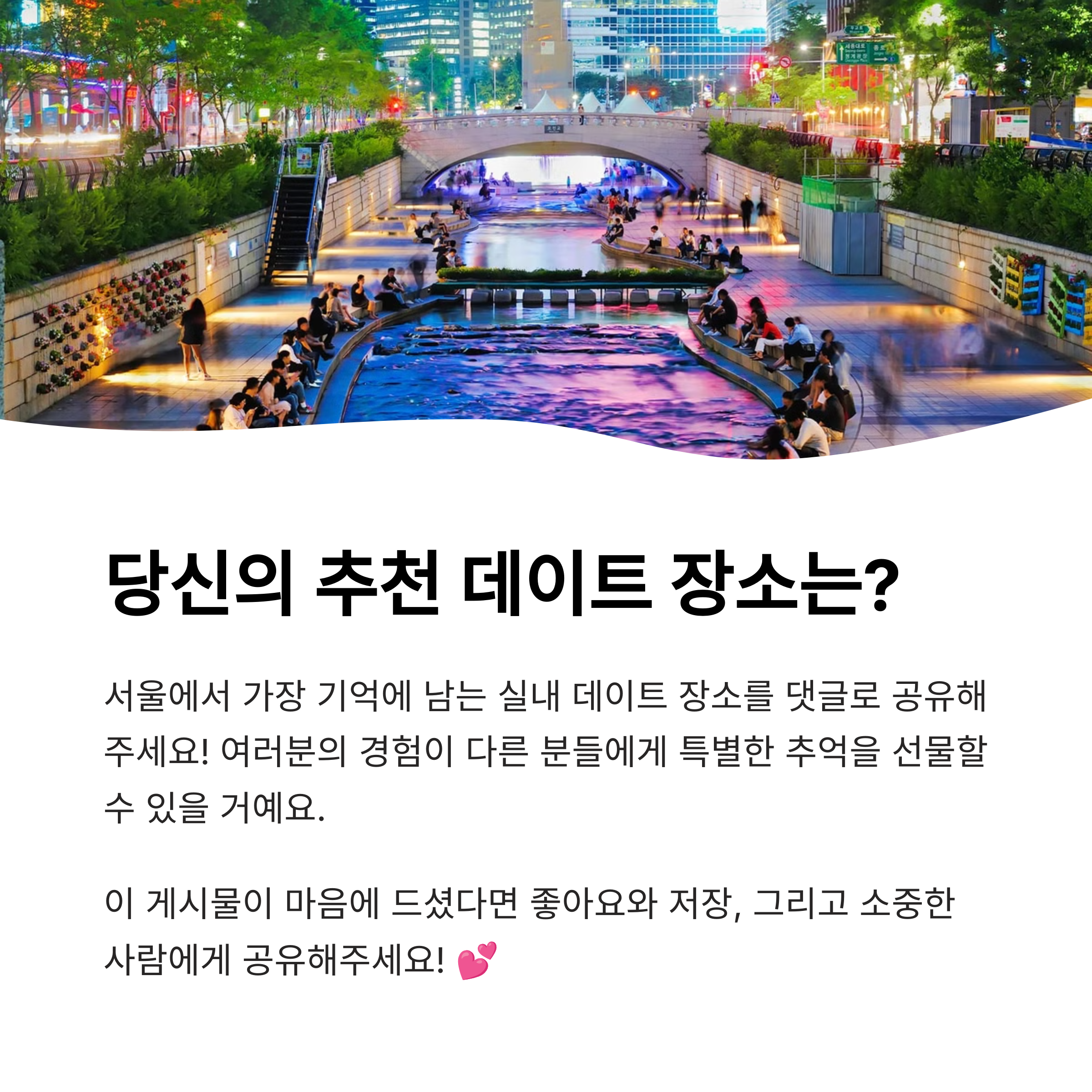 전시 감상, 조용한 책방, 분위기 좋은 카페 등 데이트로 다녀온 인상 깊은 장소가 있다면 댓글로 공유해주세요! 다양한 꿀팁이 모이면 더 완벽한 데이트가 될 거예요 :)
