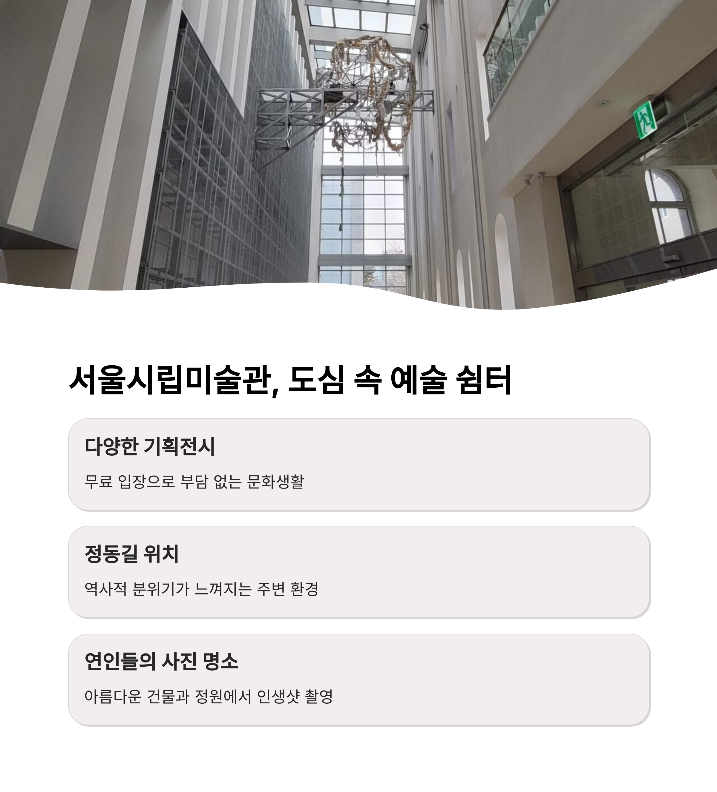 서울 실내 데이트 하면 빠질 수 없는 곳이 바로 전시 공간이에요. 리움미술관은 국내외 유명 작가들의 전시가 자주 열리며, 고요한 분위기 속에서 예술과 감성을 공유할 수 있는 데이트 코스로 추천돼요. 서울시립미술관, 국립중앙박물관 등도 무료 혹은 저렴한 입장료로 수준 높은 전시를 감상할 수 있고, 내부 카페나 휴게 공간도 잘 마련되어 있어 쉬어가기에도 좋아요.