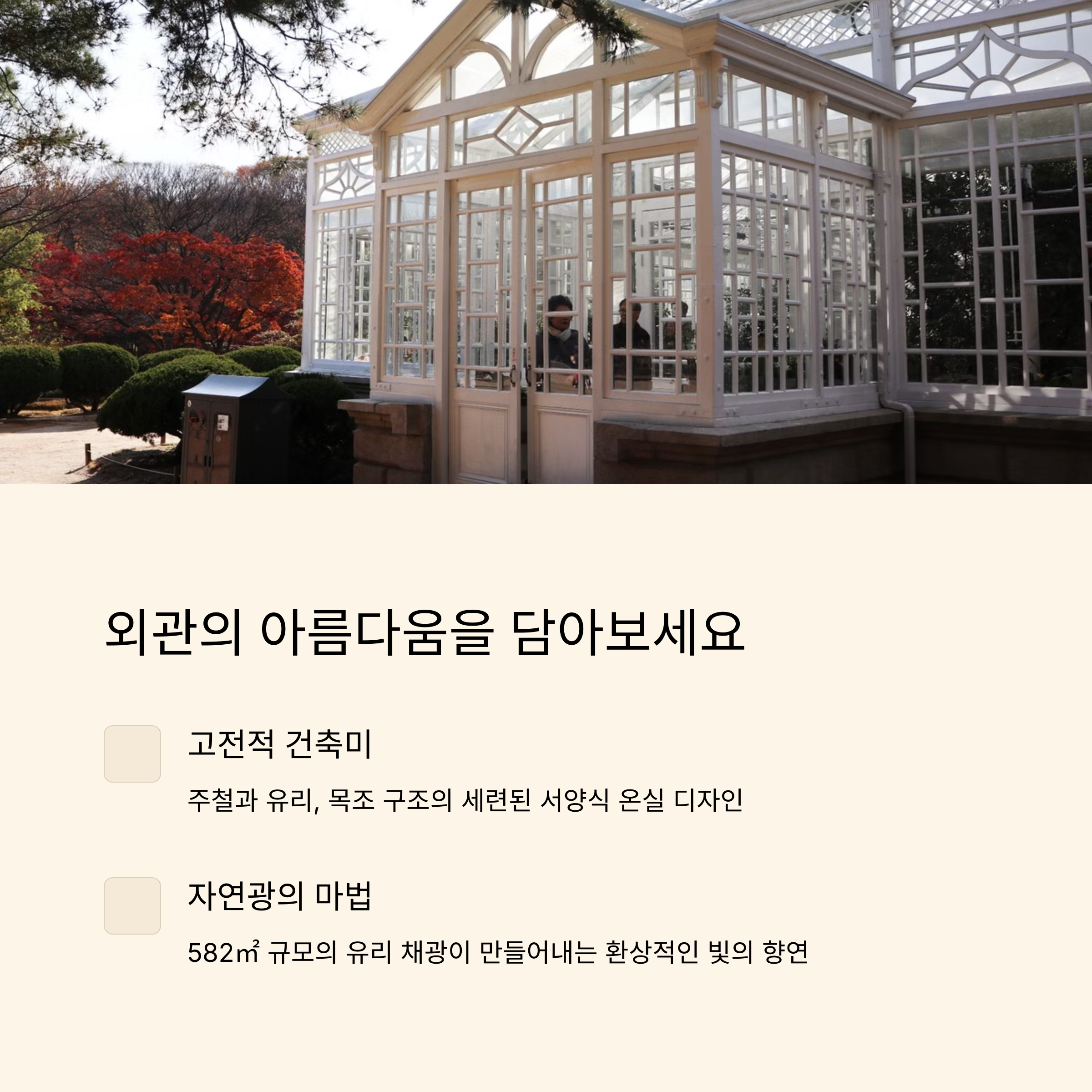 궁궐 속 유리 온실, 봄 햇살 아래 빛나는 사진 명소
