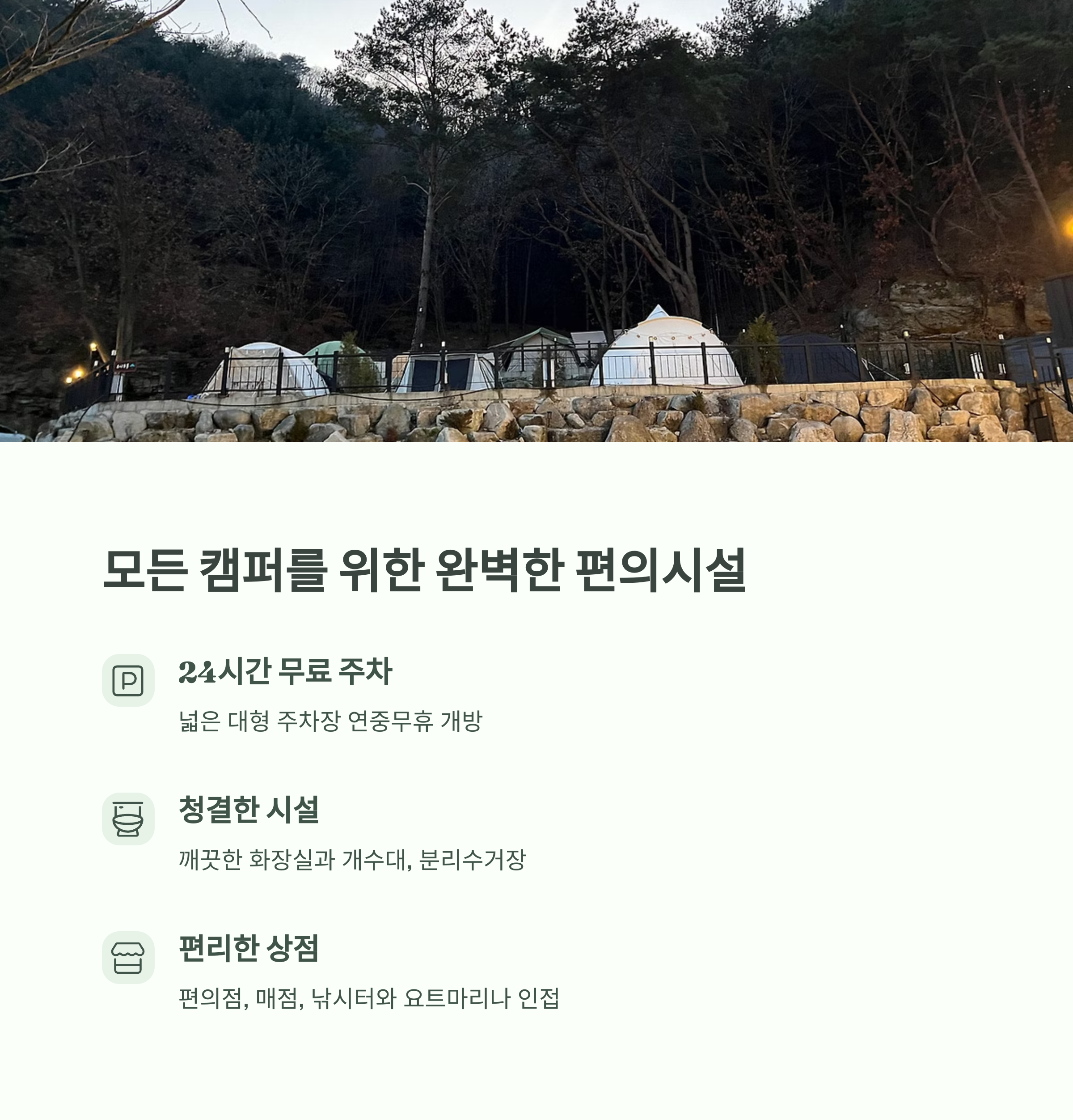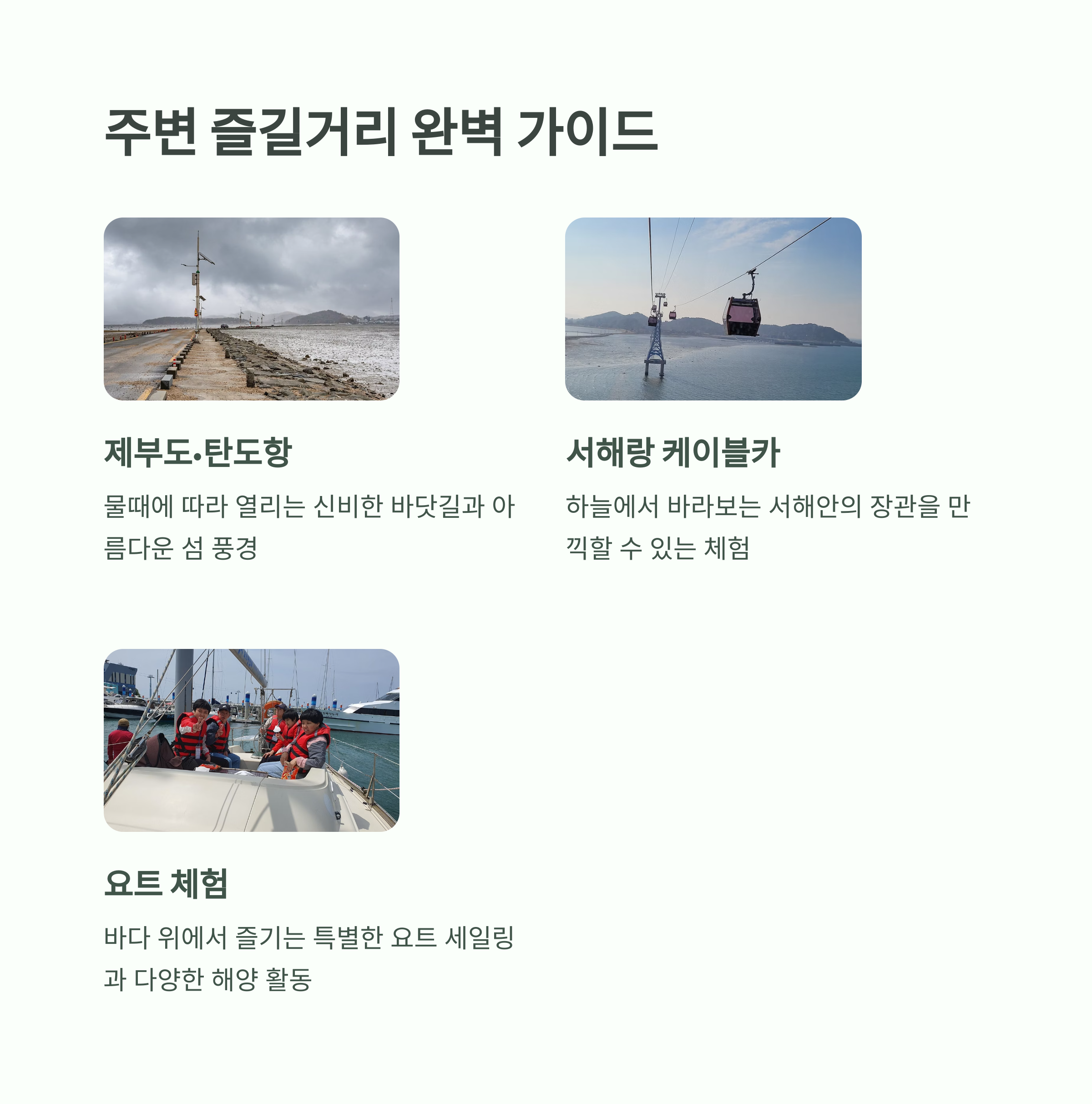 전곡항 캠핑을 더 풍성하게 만들고 싶다면 제부도, 탄도항, 궁평항과 연계한 서해 해안 드라이브 코스를 추천합니다. 서해랑 케이블카, 요트 체험, 어린이공원 등 아이들과 함께 즐기기도 좋고, 자전거 도로도 잘 정비돼 있어 뚜벅이 캠퍼들도 충분히 만족할 수 있습니다. 일몰 후에는 전곡항 마리나를 따라 야경 산책도 빼놓지 마세요.
