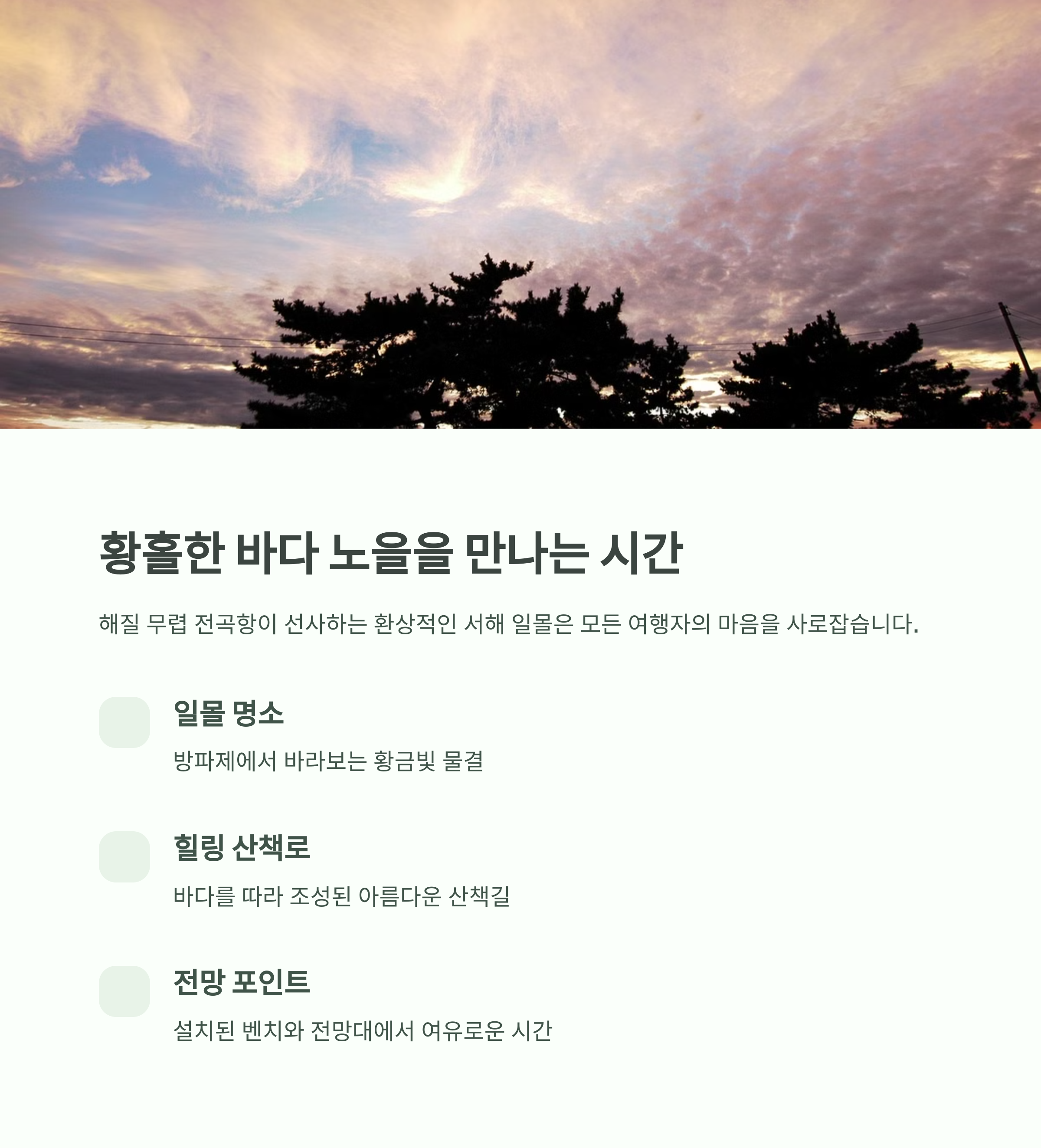 서해 노을, 시원한 바닷바람, 먹거리까지 완벽한 전곡항은 하루쯤은 바다 옆에서 머무르고 싶은 이들을 위한 최고의 차박·캠핑 스팟입니다. 입문자도, 베테랑 캠퍼도 모두 만족할 수 있는 이유는 자연과 인프라의 균형, 그리고 여행 연계성이 뛰어나기 때문이죠. 이번 주말엔 차 안에 이불 하나 깔고, 바다 보며 커피 한 잔 어떠세요?