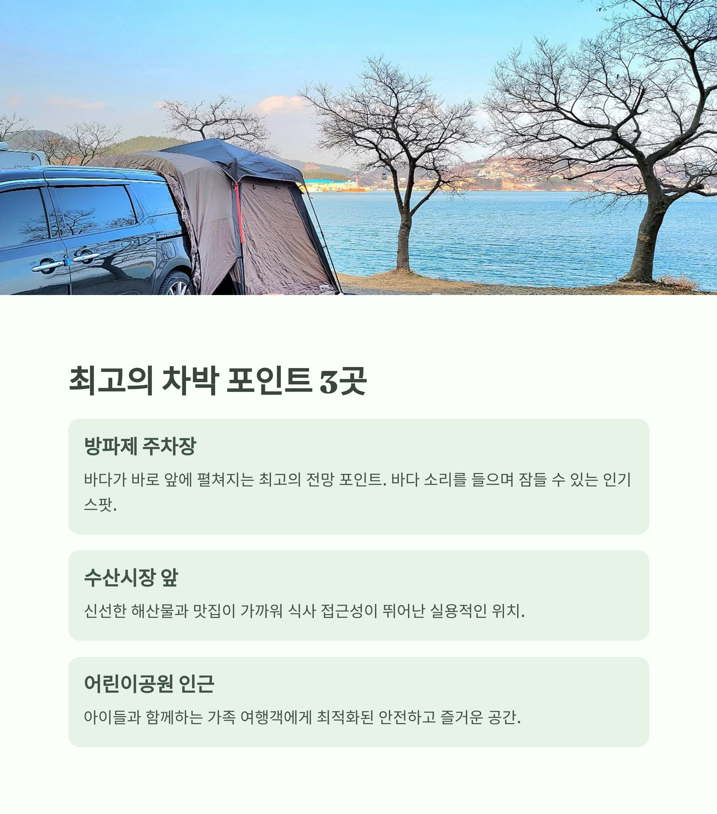 주요 차박 장소 방파제 주차장, 수산시장 앞, 어린이공원 일대
