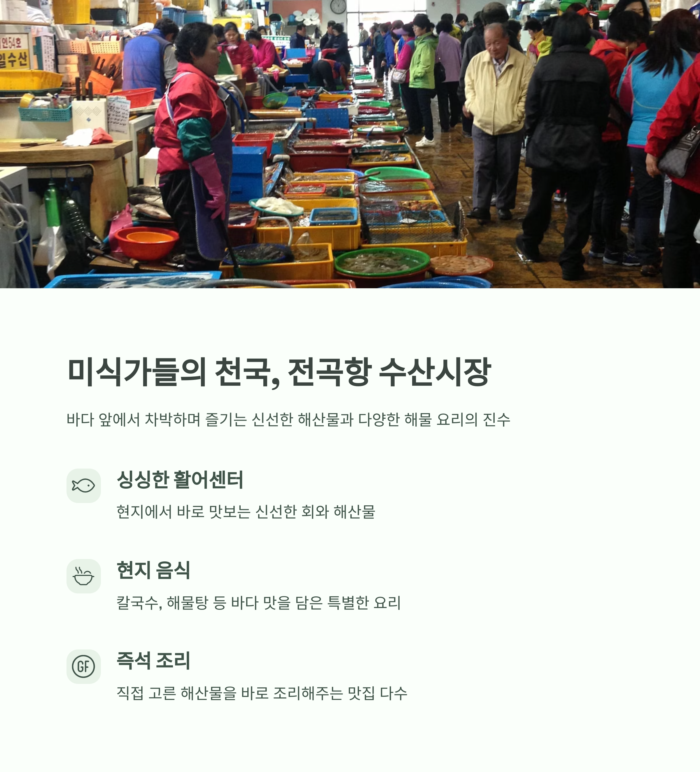 부대시설 공용 화장실, 개수대, 수산시장, 바다 전망 산책로
