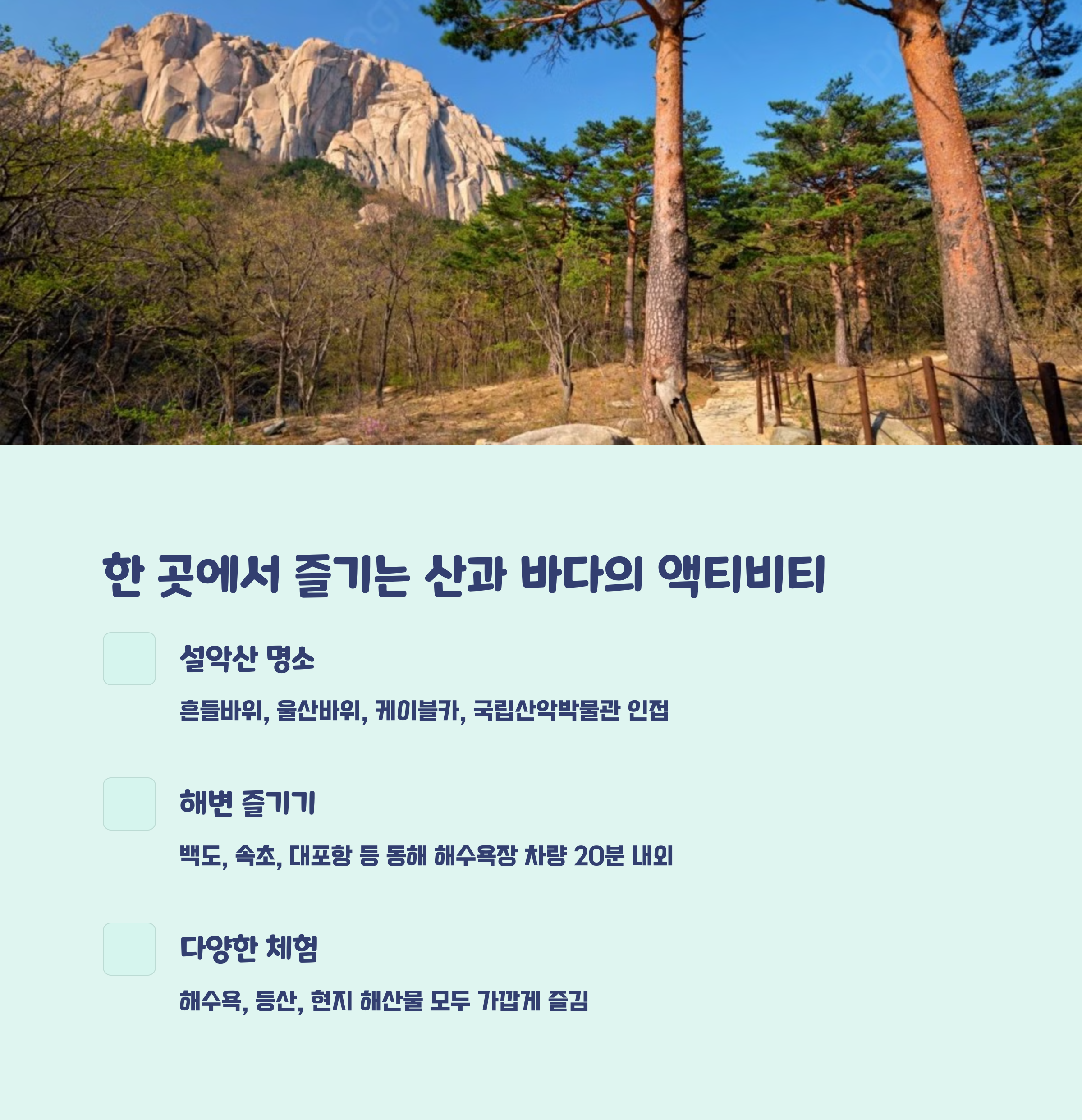 | 캠핑 + 여행 코스 | 설악산 산책, 속초 해수욕장·시장·항구, 족욕·돌담마을까지 알찬 1박2일 |