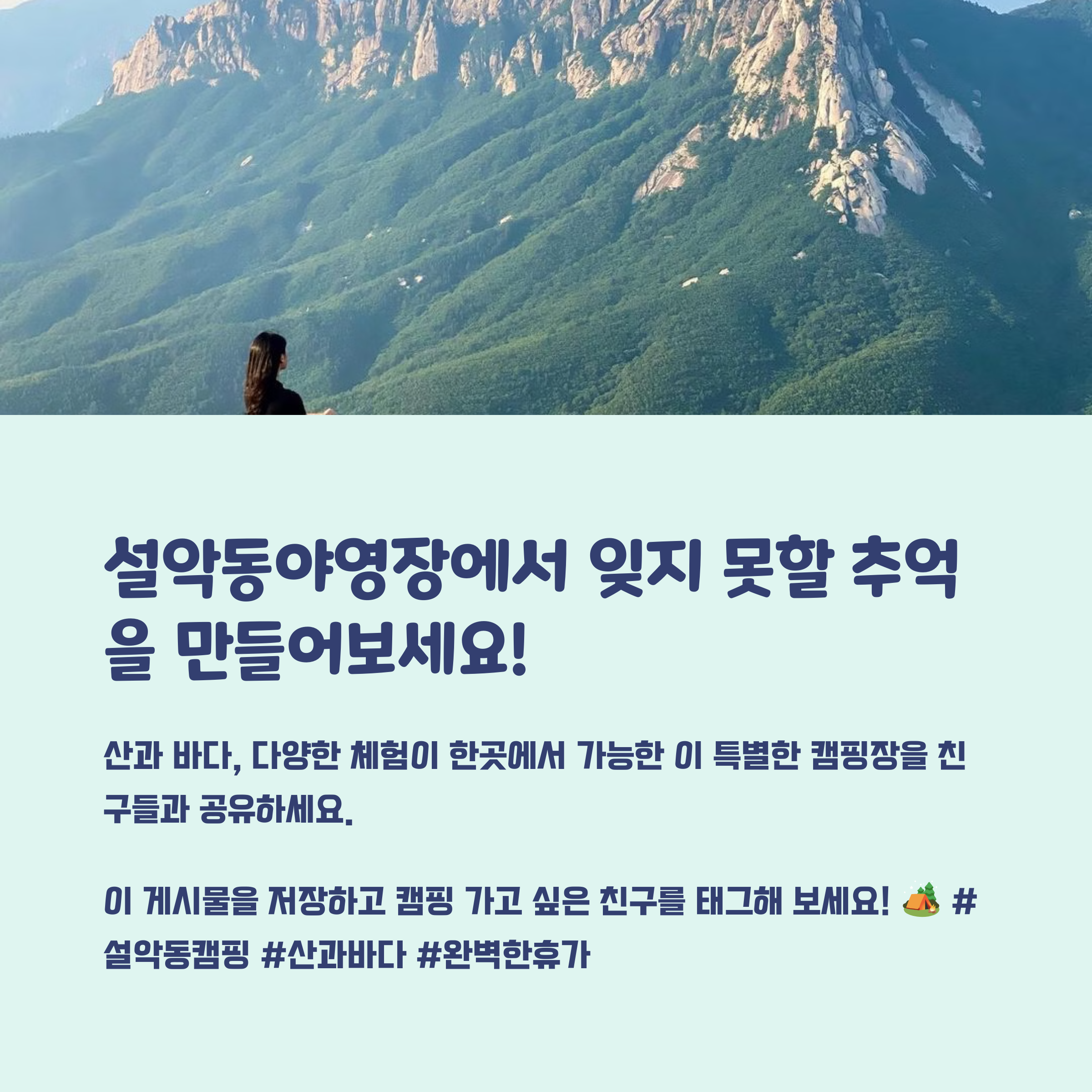 설악동야영장은 단순한 캠핑장을 넘어 설악산 자연과 속초 시티 여행을 연결해주는 허브 역할을 합니다. 자연 속 휴식과 도심 속 먹거리를 1박 2일 안에 모두 경험할 수 있으며, 잘 정비된 캠핑 환경과 알찬 동선이 캠핑 입문자부터 베테랑까지 만족시킵니다. 설악산 능선을 바라보며 불멍을 즐기고, 속초의 바닷바람과 함께 여유로운 아침을 맞이하세요.