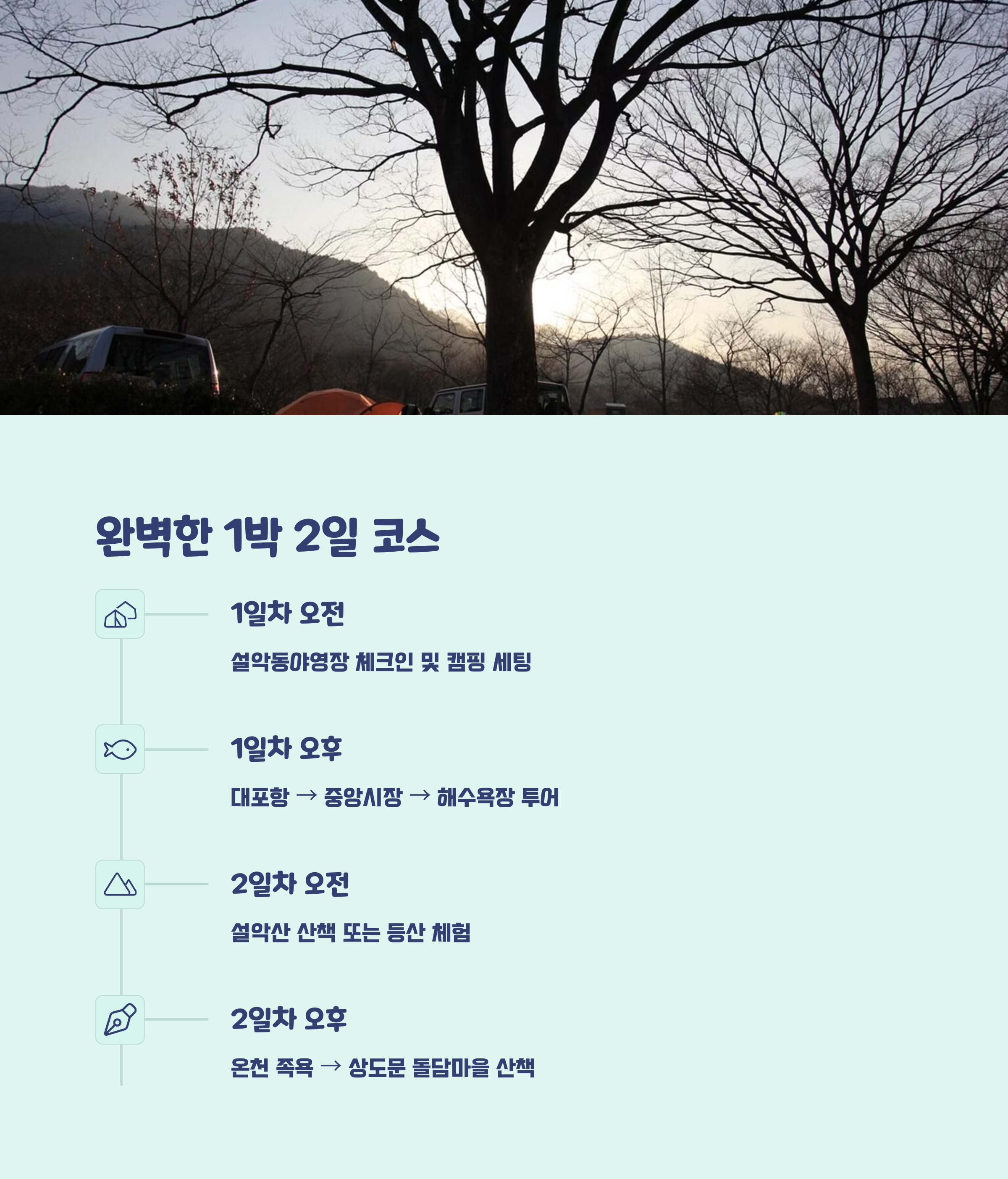 야영장 주변은 속초 시내와 인접</strong해 도보 또는 차량으로 속초해수욕장, 중앙시장, 대포항 방문이 가능하며, 밤에는 불멍과 야경 감상, 아침에는 설악산 둘레길 산책으로 하루를 시작할 수 있습니다. 상도문 돌담마을 산책이나 온천 족욕 체험도 조용한 힐링을 원하는 이들에게 인기 있는 일정입니다. 단 하루 일정으로도 자연, 먹거리, 체험이 조화를 이루는 속초형 캠핑 여행을 누릴 수 있습니다.