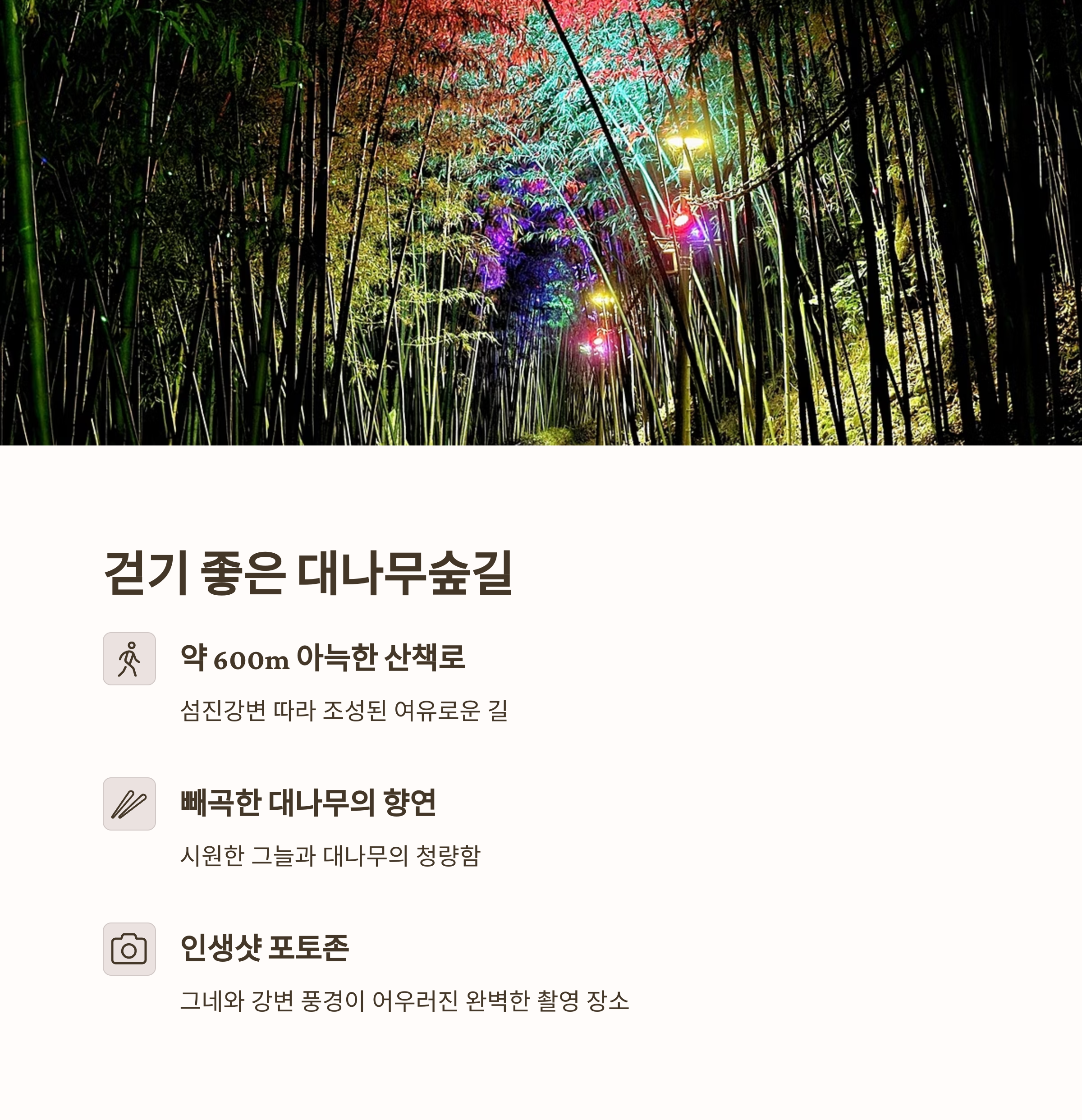 | 대나무숲길 | 섬진강변 약 600m, 대나무 숲과 포토존, 가족·어르신 산책에 적합 |