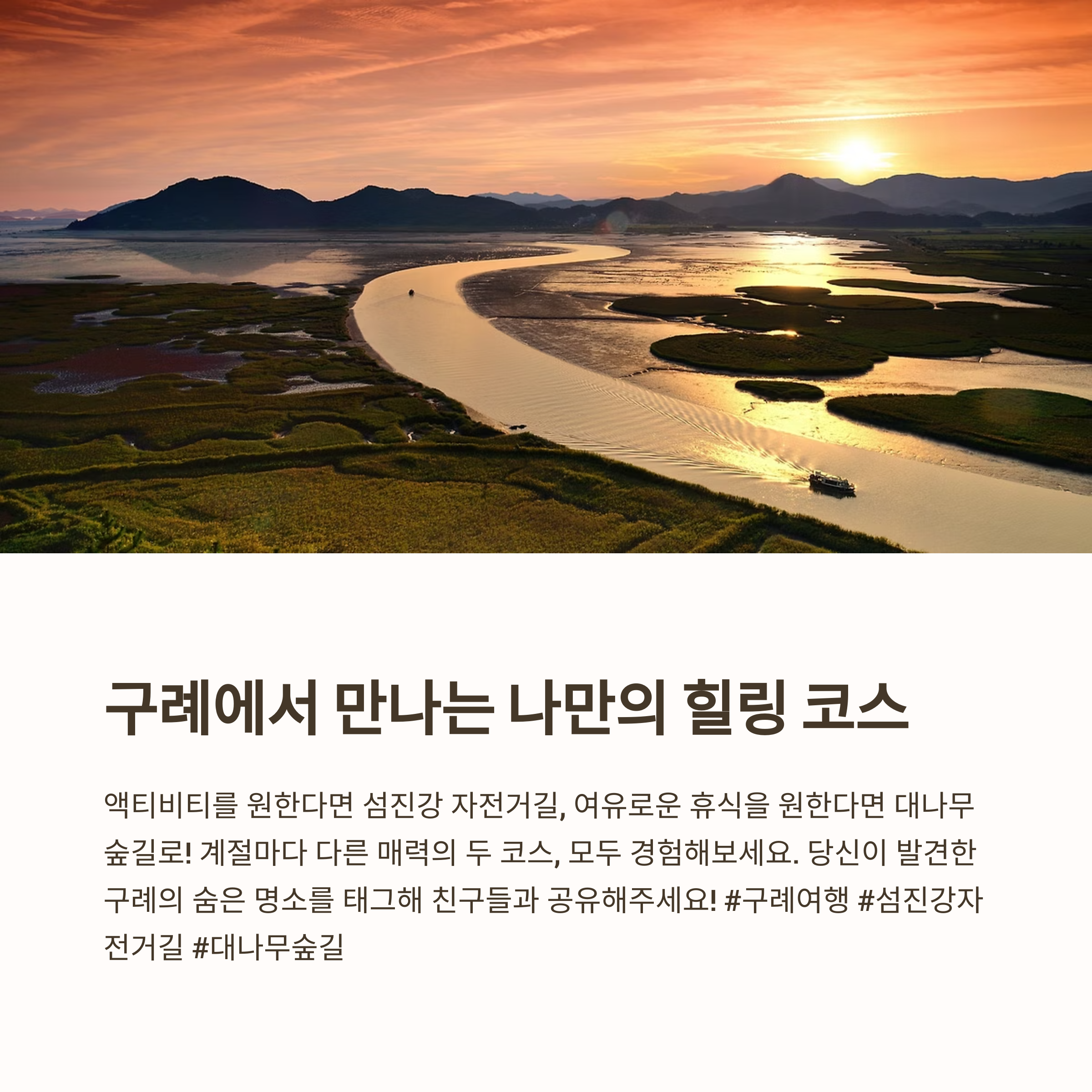 구례의 강변을 따라 펼쳐진 섬진강 자전거길과 대나무숲길은 각각 다른 매력을 지닌 힐링 코스로, 여행의 목적과 분위기에 따라 선택의 즐거움이 있습니다. 활동적인 라이딩을 원한다면 자전거길을, 고요한 자연 속 산책을 원한다면 대나무숲길을 추천드리며, 여유가 있다면 두 코스를 하루에 함께 즐겨보는 것도 특별한 여행이 될 것입니다.
