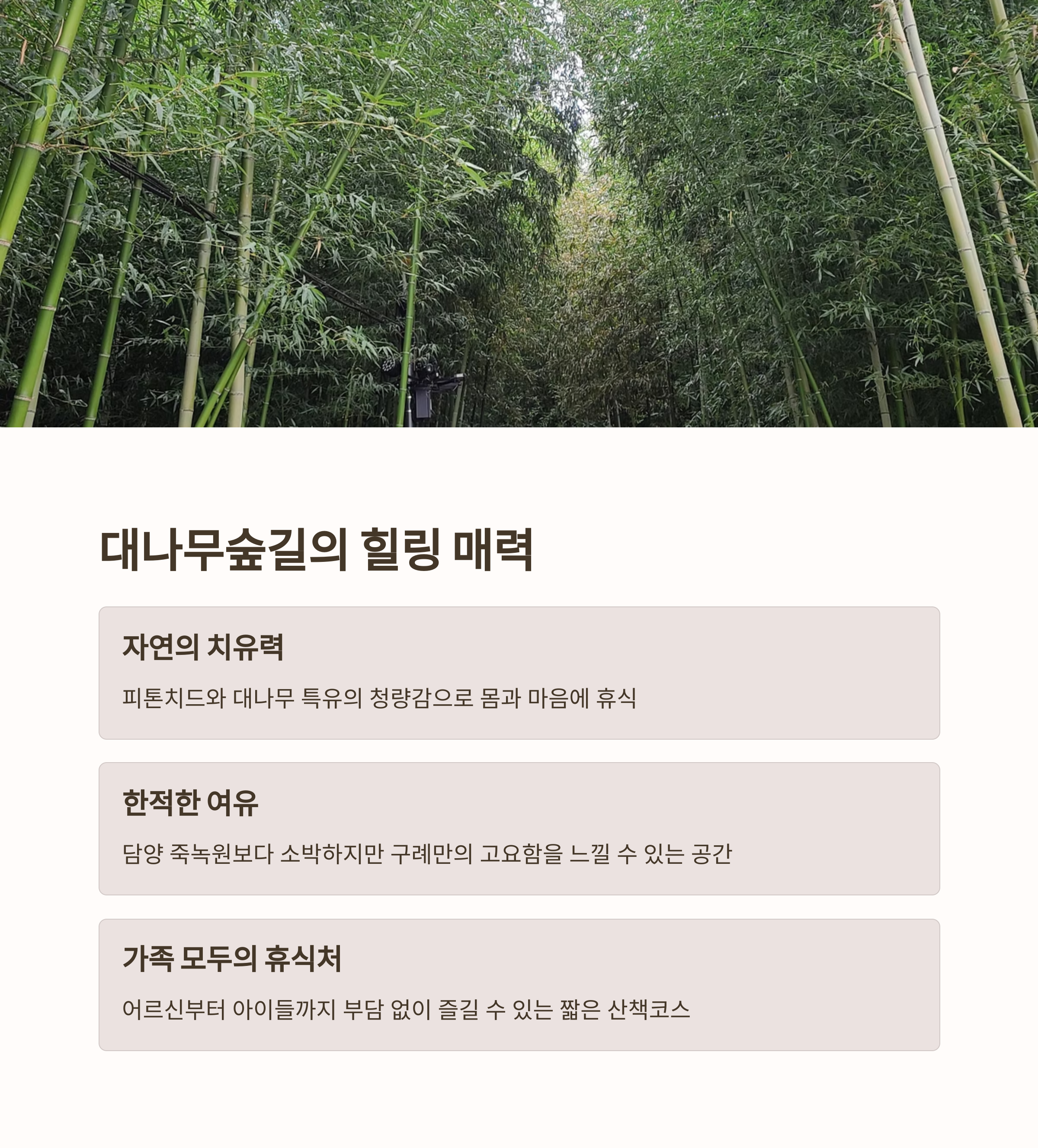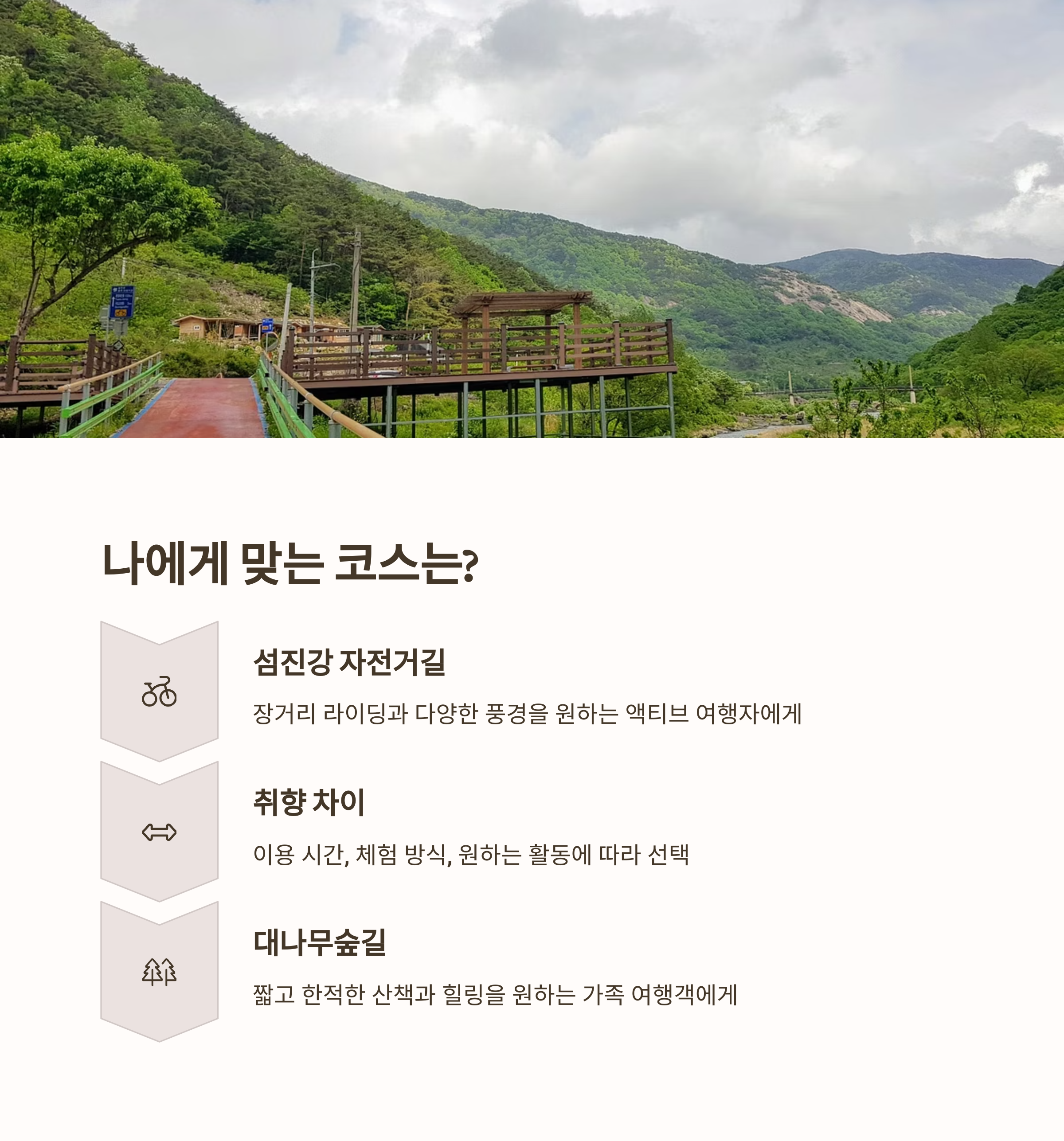 | 79km, 평탄한 장거리, 초보자도 가능, 벚꽃·갈대 명소 | 600m, 대나무 피톤치드, 산책로, 포토존 있음 | 섬진강변 위치, 힐링 코스, 사계절 풍경 아름다움 |
