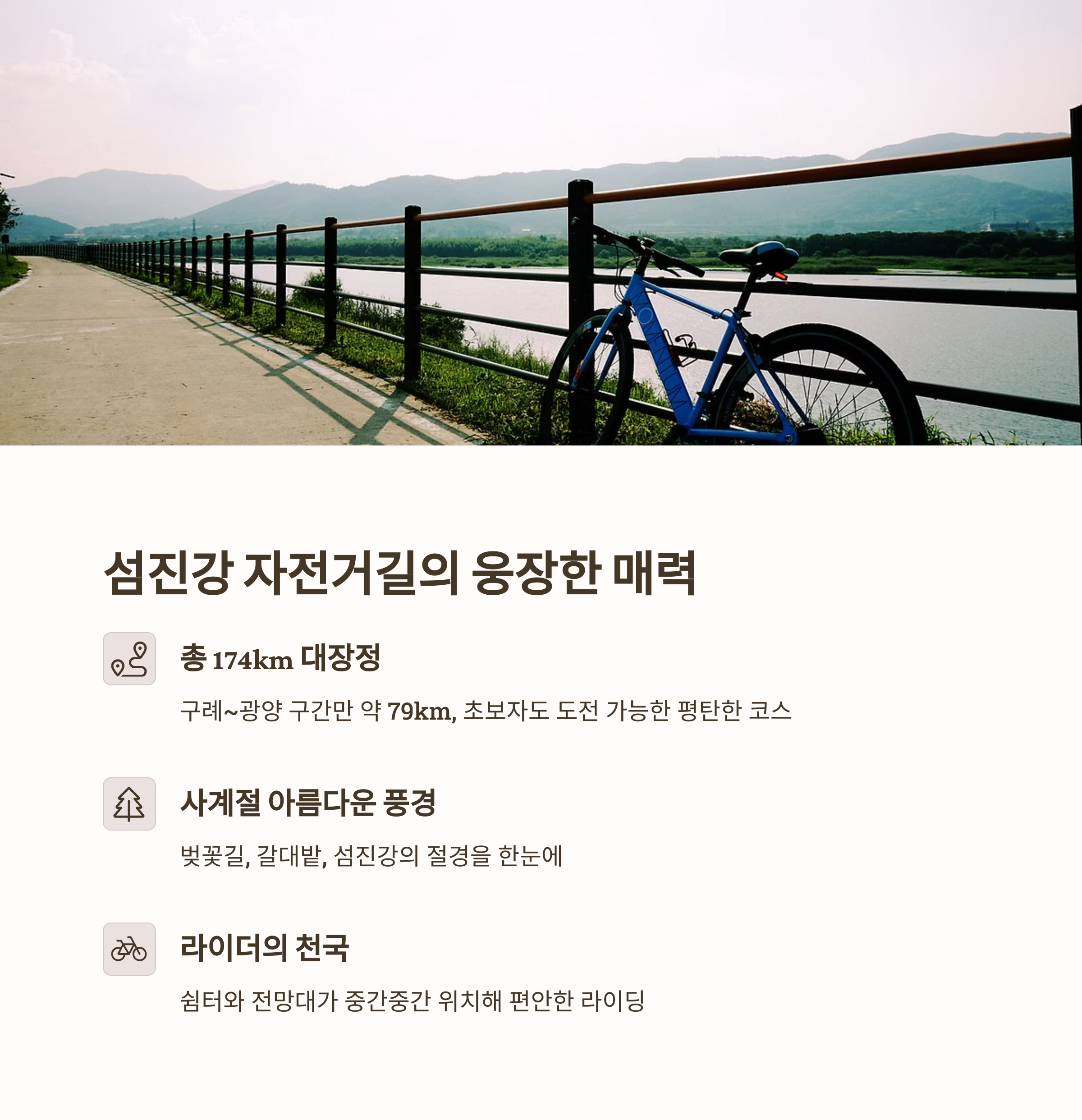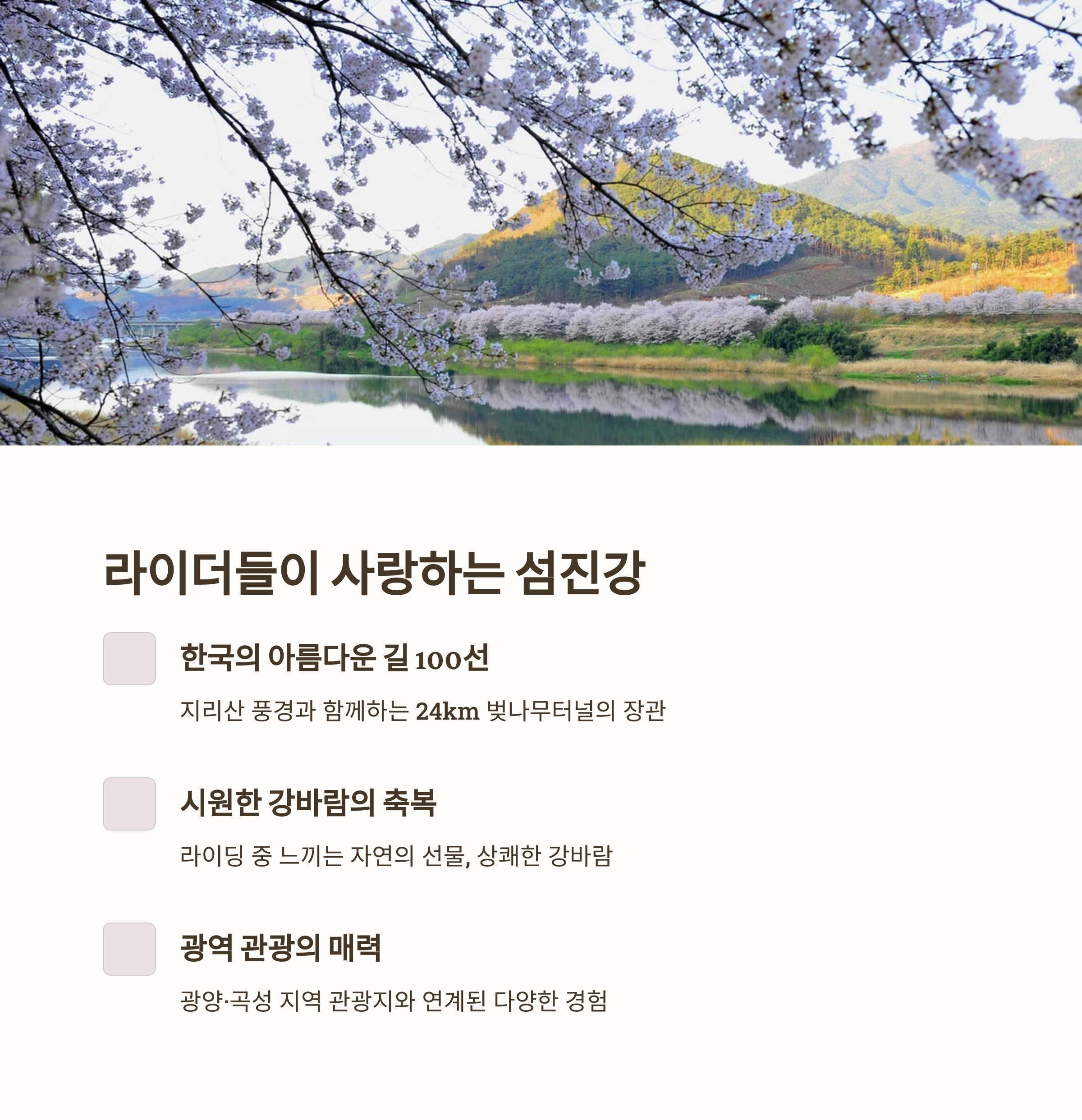 | 섬진강 자전거길 | 구례~광양 약 79km, 평탄한 코스와 다양한 자연 풍경, 벚꽃·갈대길 포함 |