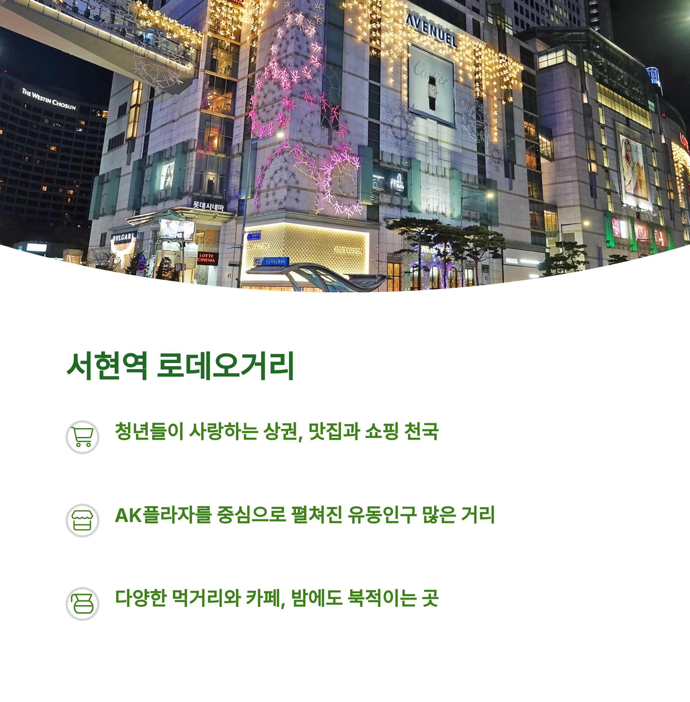 두 번째는 서현역 로데오거리입니다. 분당의 젊은 상권을 대표하는 이곳은 트렌디한 음식점과 카페, 패션 매장이 밀집해 있어 쇼핑과 데이트 모두를 만족시켜주는 거리입니다. 주말 저녁이면 젊은 인파로 북적이며, 야경과 함께 즐기는 분위기 좋은 테라스 카페도 많아 분당의 감성을 느끼기에 충분한 장소죠. 트렌디한 감각을 원하는 분들에게 추천합니다.