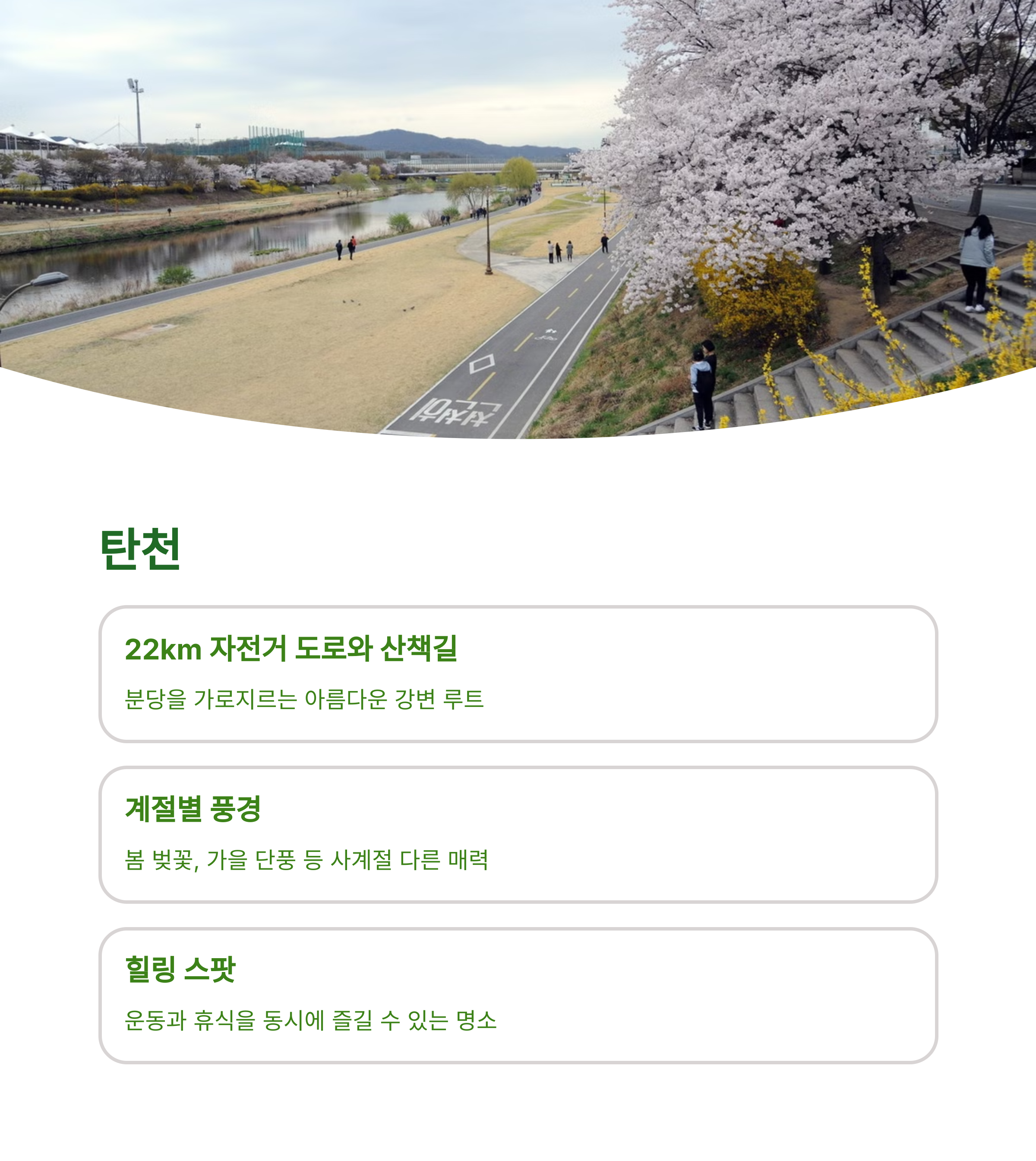 탄천은 자연과 운동이 공존하는 힐링 코스로, 사계절 모두 산책과 자전거 타기에 좋은 장소입니다. 율동공원은 대형 호수와 넓은 잔디광장, 책 테마파크와 같은 가족 친화적인 시설이 함께해 아이들과의 외출 장소로 손꼽힙니다. 마지막으로 정자동 카페거리는 유럽 분위기를 닮은 세련된 거리로, 감성 있는 데이트 장소 또는 조용한 혼자만의 카페 투어 장소로도 최고의 선택지가 됩니다.