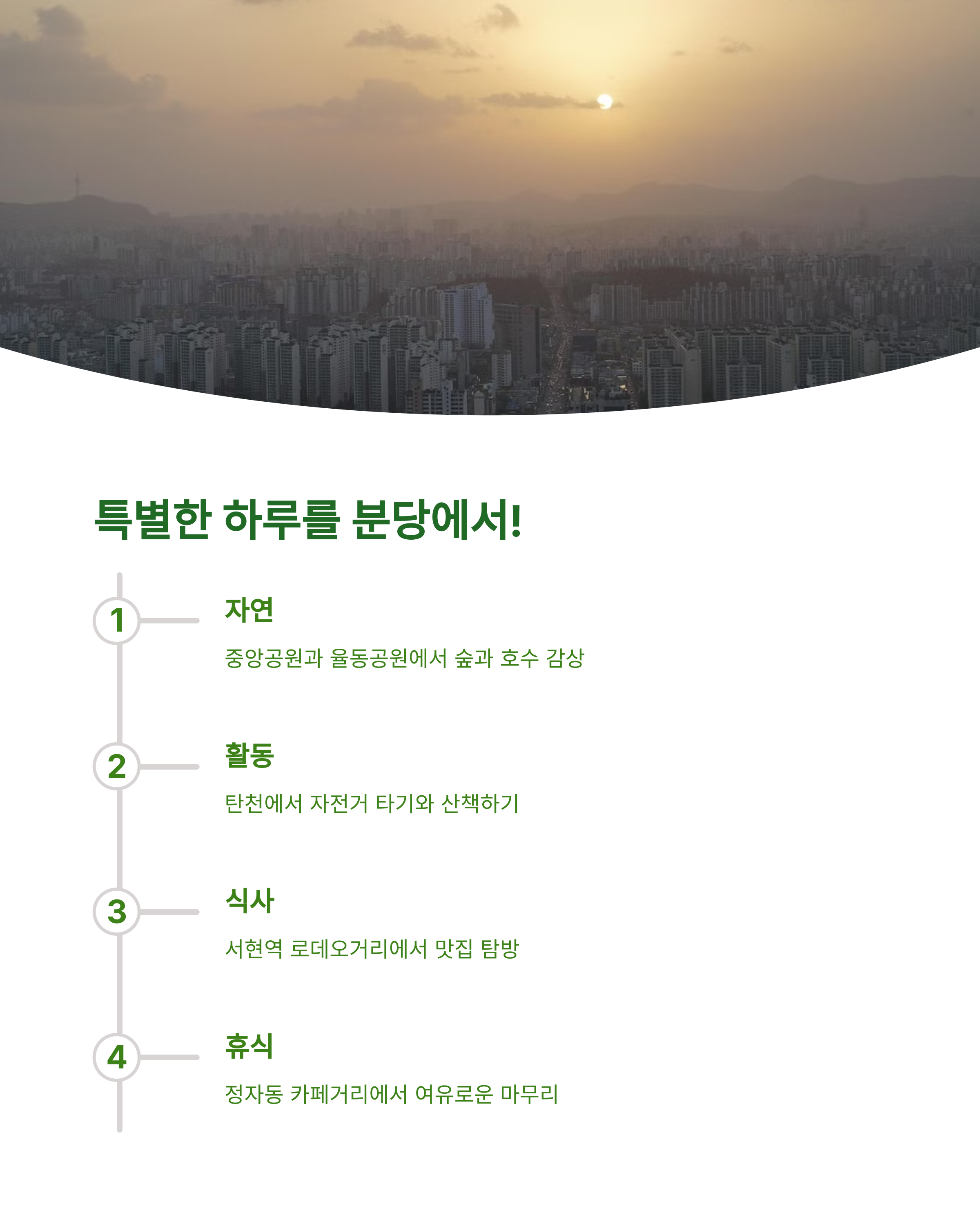 | 분당중앙공원, 탄천, 율동공원 등 녹지공간과 산책로 | 서현 로데오거리, 정자동 카페거리에서 트렌드 체험 | 공원, 도서관, 테마파크 등 어린이 동반 추천 코스 |