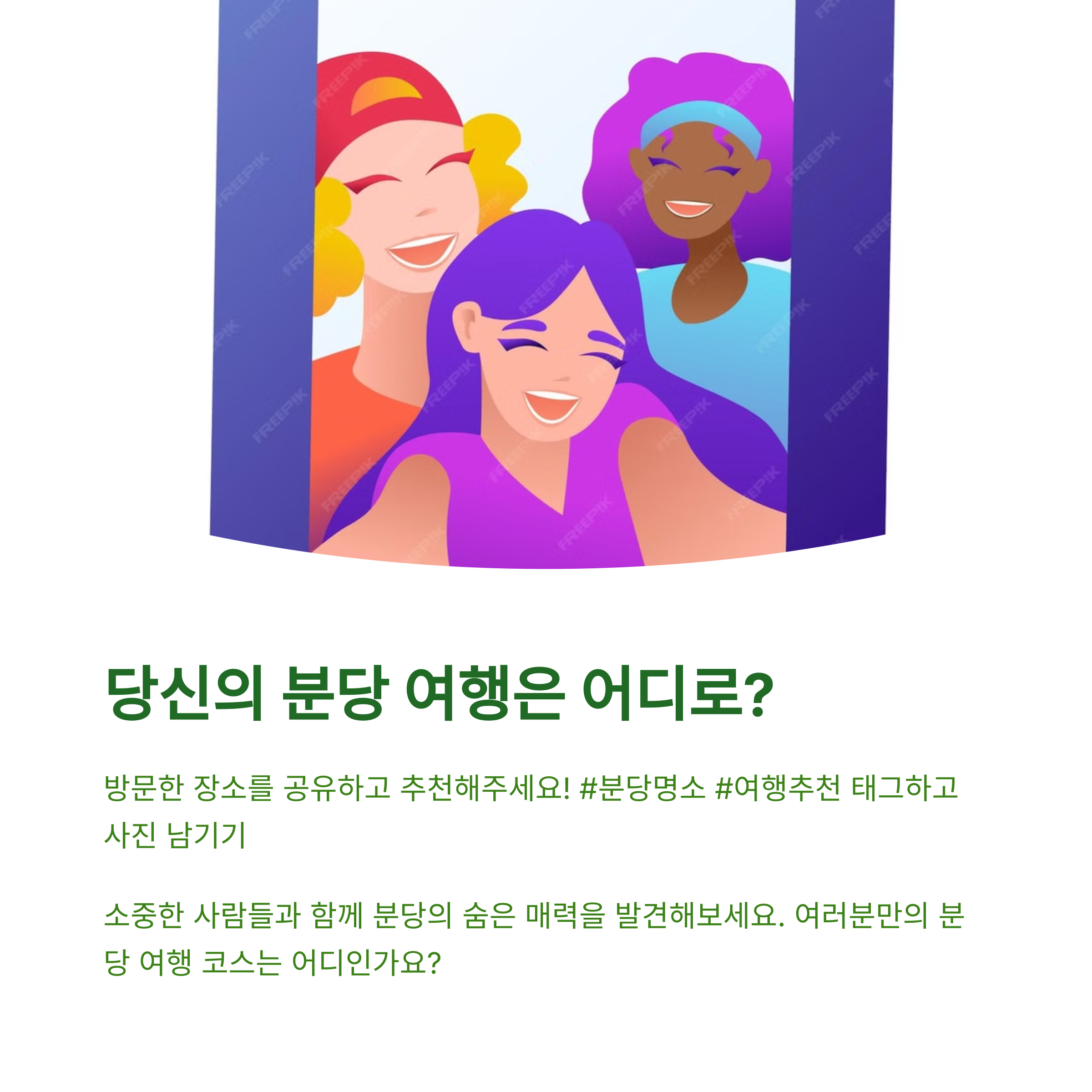 위에 소개된 장소 외에도 분당에서 가볼만한 숨은 명소가 있다면 댓글로 추천해주세요! 다양한 경험이 모여 더 알찬 지역 정보를 만들 수 있습니다.