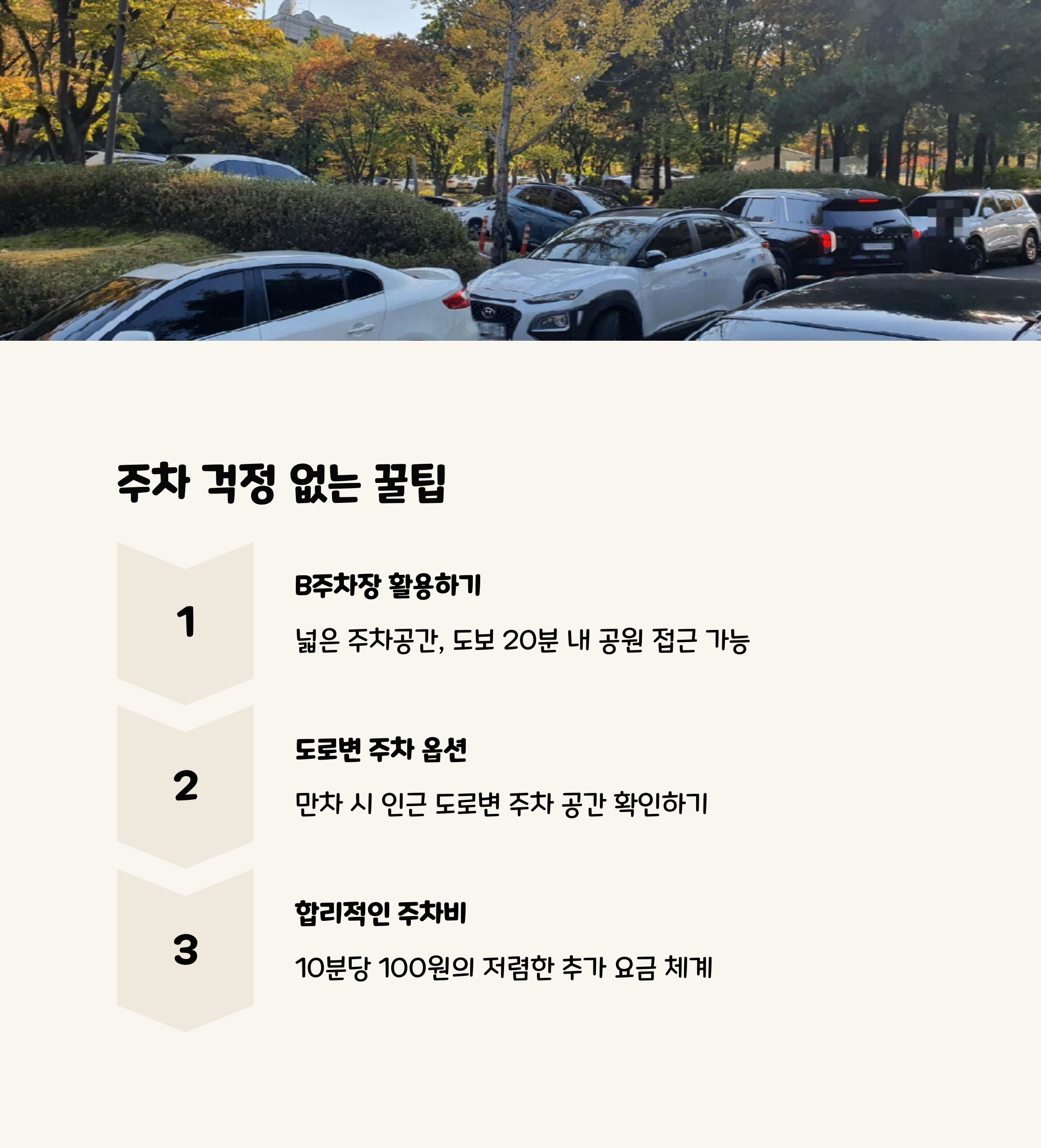 주차 팁 | A주차장 오전 10시 이전 도착, 만차 시 B주차장 이용 |