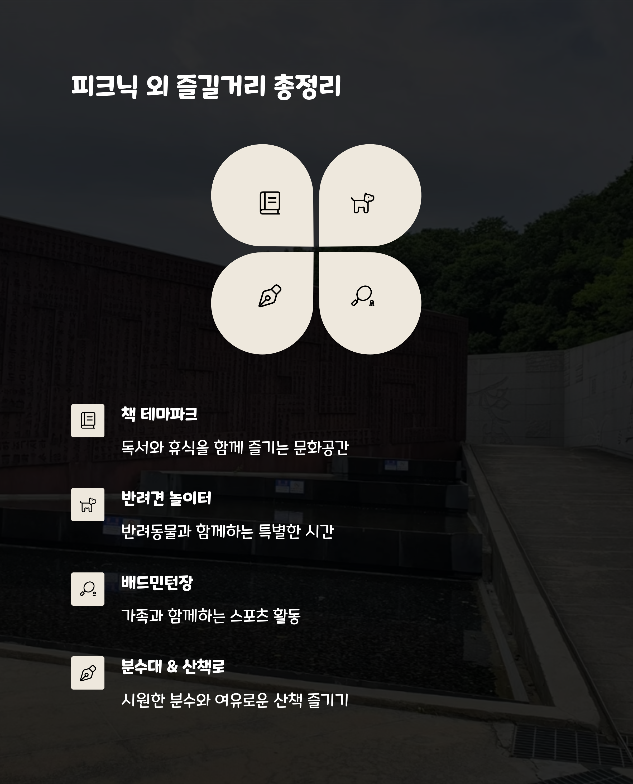 텐트를 설치할 예정이라면 아담한 사이즈를 추천드립니다. 공원 규정상 대형 텐트는 설치가 어렵고, 바닥이 울퉁불퉁한 곳이 많아 발포매트나 두꺼운 돗자리를 챙기면 훨씬 쾌적한 피크닉이 가능합니다. 아이가 있다면 여벌옷, 물티슈, 모래놀이 장난감 등도 필수 준비물이며, 갑작스러운 날씨 변화에 대비해 우산이나 양산도 함께 챙기는 것을 추천드립니다. 그늘이 많지 않으므로 자리를 잘 선택하는 것도 피크닉 만족도를 크게 좌우합니다.